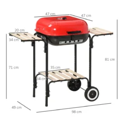 - – MATERIALES DE CALIDAD: Barbacoa de acero con revestimiento de porcelana en la estructura y en la tapa para mayor resistencia y durabilidad. Puede soportar hasta 600º de temperatura. – FÁCIL CONTROL DE LA TEMPERATURA: Esta barbacoa de carbón tiene rejillas de ventilación en la tapa de la parrilla que se ajustan para controlar la temperatura, sin la necesidad de abrir la tapa mientras cocinas. También incluye ventilación en la parte inferior para controlar la combustión del carbón. – RUEDAS RESISTENTES: Las 2 ruedas permiten mover la parrilla fácilmente donde la necesites. – AMPLIO ESPACIO DE ALMACENAMIENTO: Incluye 2 estantes laterales de madera ideales para colocar alimentos, platos o cualquier utensilio de cocina. En la rejilla inferior puedes guardar otros elementos esenciales necesarios para la barbacoa. – MEDIDAS TOTALES: 98x49x81cm (LxANxAL. Medidas de la parrilla de asado: 43×40 cm (LxAN. Medidas de la parrilla de carbón: 36×36 cm (LxAN. Peso máximo soportado: 5 kg. Nota: No se permiten llamas abiertas, solo se recomienda carbón