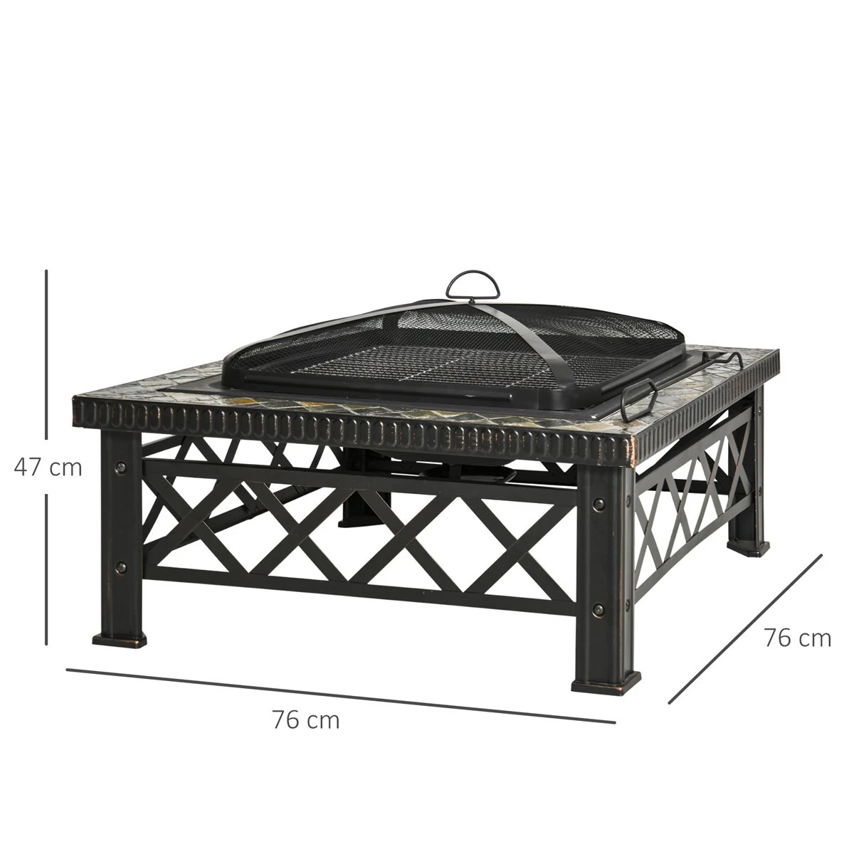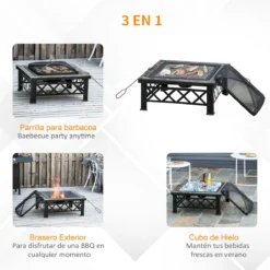 Disfruta de una bonita velada al aire libre con tu familia o amigos alrededor de este brasero de Outsunny. Puedes utilizarlo solo como fuente de calor o como barbacoa y, cocinar vuestros platos favoritos a la parrilla. También puedes usarlo como cubo de hielo. Incluye una tapa de malla para evitar que salten brasas y un atizador para avivar el fuego, mover la leña o quitar la tapa con seguridad. Su estructura metálica resiste altas temperaturas. Características – Ideal para utilizar en el jardín, patio, terraza o sitios similares. Crea un ambiente acogedor y romántico – Brasero multifuncional 3 en 1, además de brasero puede usarse como BBQ o cubo de hielo para colocar bebidas refrescantes – Estructura de metal con cuenco para carbón resistente a temperaturas de hasta 500 grados centígrados – Incorpora una cubierta de malla de seguridad para evitar que salten brasas – Incluye atizador para avivar el fuego, mover la leña y quitar la tapa con seguridad – Incluye parrilla para barbacoa – Se requiere montaje rápido y sencillo, se incluyen instrucciones Especificaciones – Color: negro – Material: pizarra y metal – Medidas totales: 76x76x47 cm (LxANxAL – Medidas del cuenco de fuego: 60,5×60,5 cm (LxANxAL – Medidas de la tapa: 53x53x10 cm (LxANxAL – Medidas de la parrilla: 33×33 cm (LxAN – Medidas del atizador: 50×5 cm (LxAN – Medidas de la parrilla: 50×50 cm (LxAN – Grosor de la chapa: 0,5 mm – Referencia: 842-170