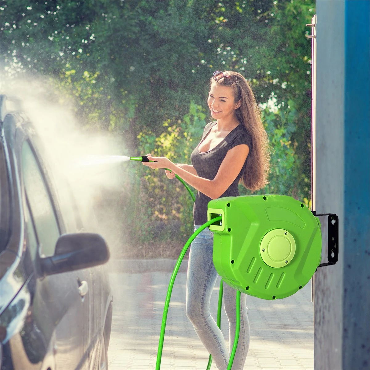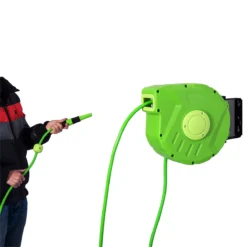 Este carrete para manguera tiene una gran variedad de aplicaciones domésticas: se puede usar para el riego de jardines y flores, para la limpieza del hogar y también para limpiar tus vehículos. Este dispositivo está fijado en la pared y utiliza una tubería de agua retráctil, muy estable y práctico. Permite una rotación de 180 grados, de modo que puede aumentar la cobertura de riego. Está hecho de materiales de alta calidad para garantizar el uso a largo plazo en exteriores. Se enrolla de forma fácil y automática sin ocupar espacio ¡Es una gran solución para evitar los nudos y el desorden de las mangueras tradicionales! Características – Carrete portamanguera muy útil con 10m de manguera y 1m de cable de conexión – Ideal para el riego de jardín, limpieza doméstica, limpieza de vehículos, etc. – La manguera se bloquea con una bola que puede fijarse en cualquier longitud – Ángulo de rotación de 180 ° que amplía la cobertura de riego y ahorra espacio cuando se pliega – La fijación de pared es fácil de desmontar para proteger el producto cuando no esté en uso – Se enrolla automáticamente de forma ordenada y compacta – Cubierta de PP de alta calidad y manguera de PVC que garantiza la máxima resistencia – Fijación estable en la pared. Accesorios de fijación incluidos Especificaciones – Color: Verde Material: PP, PVC – Longitud de la manguera: 10m Longitud del cable conductor de 1m – Presión del agua: 8bar Presión máxima del agua: 24bar Temperatura recomendada: -5-45℃ – Dimensiones del paquete: 35,5×11,5×27,5 cm (LxANxAL – Peso bruto: 3.65 kg Referencia: 845-181