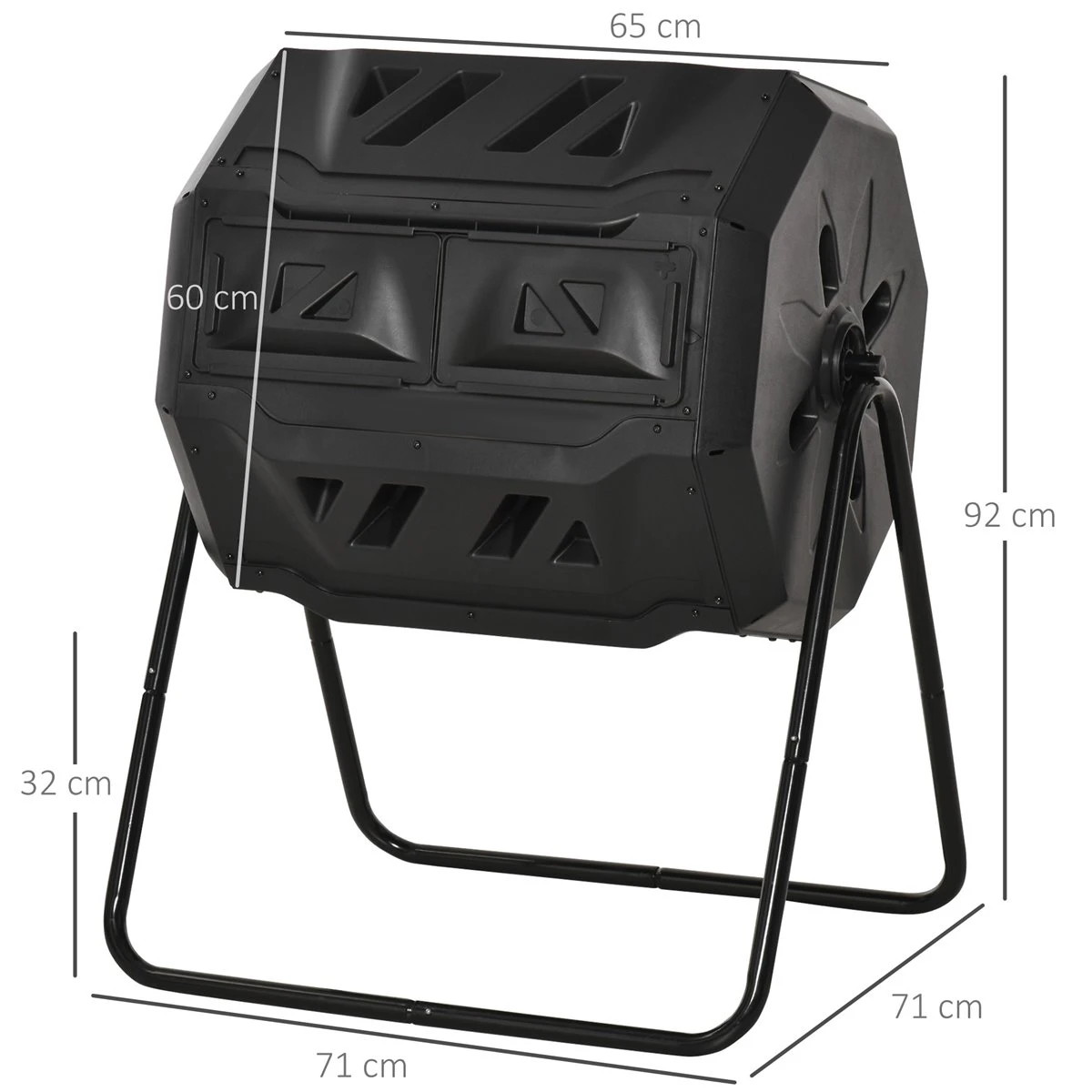 - – DOBLE CÁMARA: Diseñado con 2 cámaras que es la forma más eficiente de producir compost. Mientras un lado está produciendo, puede añadir nuevos ingredientes al otro lado al mismo tiempo. El intercambio constante de materiales en ambos lados crea un ciclo – GIRATORIO 360°: El sistema de rotación de 360° te permite tener las manos libres, evita mezclar y escarbar la pila de compost con las manos, proporcionando una forma más eficiente y eficaz de realizarlo. Llena el cubo con los restos de comida o residuos de la cocina y el jardín, cierra la puerta y gira el compostador cada dos días – SISTEMA DE VENTILACIÓN EXTRAORDINARIO: El cubo de compostaje con capacidad de hasta 160L, tiene 8 orificios de ventilación a cada lado del tambor, que benefician la circulación del aire, y descargan el aire y el agua fermentados – RESISTENTE Y FUNCIONAL: Este cubo de compostaje está hecho de acero de primera y plástico de polipropileno, resistente y durado. Este aparato de compostaje también tiene puertas correderas – MEDIDAS TOTALES: 71x64x96 cm (LxANxAL; Medidas del cubo: Ø60×65 cm; Capacidad: 160L