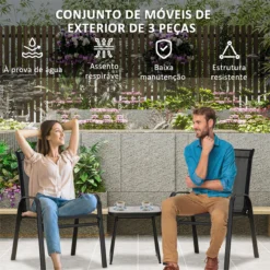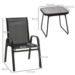 Este conjunto de muebles de exterior de Outsunny es ideal para disfrutar en compañía de una agradable y relajante tarde de verano. Se compone de 2 cómodos sillones y 1 mesa de centro. Fabricado con una robusta estructura de acero y asientos de tejido textileno transpirable y fácil de limpiar. Lo mejor de todo es que, cuando no se usan, las sillas se pueden apilar para ahorrar espacio. Este conjunto de muebles de jardín será el complemento perfecto para disfrutar de tu tiempo libre. Características – Conjunto de muebles de jardín de 3 piezas, compuesto por una mesa y dos sillas – Fabricado con estructura de acero y tejido textileno transpirable para mayor durabilidad – Apila las sillas cuando no estén en uso para un almacenamiento más conveniente – Patas con pies con almohadillas antideslizantes, para mayor estabilidad y no rayar el suelo – Se requiere montaje Especificaciones – Color: gris, negro – Material: acero, poliéster, plástico PSC – Medidas de la mesa: 45,5×45,5×45 cm (LxANxAL – Medidas de los sillones: 68×57,5×93 cm (LxANxAL – Medidas del asiento: 48×45 cm (LxAN – Altura del asiento: 43,5 cm – Medidas del respaldo: 48×52 cm (LxAN – Carga máximo: 25 kg (mesa, 120 kg (cada sillón – Referencia: 84G-029V00BK
