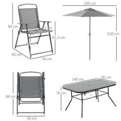 - – CONJUNTO DE JARDÍN DE 8 PIEZAS: Viene con una mesa rectangular, una sombrilla y seis sillas de malla a juego para que puedas tomar el té, jugar, hablar con tus invitados y mucho más. Las sillas se pueden plegar para guardarlas cómodamente cuando no se usan – SOMBRILLA REGULABLE: La mesa tiene un orificio central de 51 mm para colocar la sombrilla. Por su parte, la sombrilla de 230 cm de diámetro, se abre y cierra fácilmente, es anti UV y tiene un poste reclinable para que puedas orientarla según la incidencia del sol – METAL RESISTENTE: La estructura de metal con recubrimiento en polvo ofrece unos muebles de exterior con gran resistencia a la oxidación y a la intemperie. En cuanto a las sillas, tienen estructura de metal y asiento y respaldo de malla transpirable que proporciona una sensación de frescor al sentarse – ENCIMERA DE CRISTAL TEMPLADO: La mesa de este conjunto de comedor de jardín tiene una encimera rectangular de cristal templado de color negro. Resistente y fácil de limpiar, ideal para tomar un aperitivo con los amigos o comer en ella – MEDIDAS TOTALES: 140x90x70 cm (mesa, 65x56x90 cm (sillas y Ø230×210 cm (sombrilla. Peso máximo soportado: 70 kg (mesa y 114 kg (silla. Requiere montaje. IMPORTANTE: La base de la sombrilla no está incluida