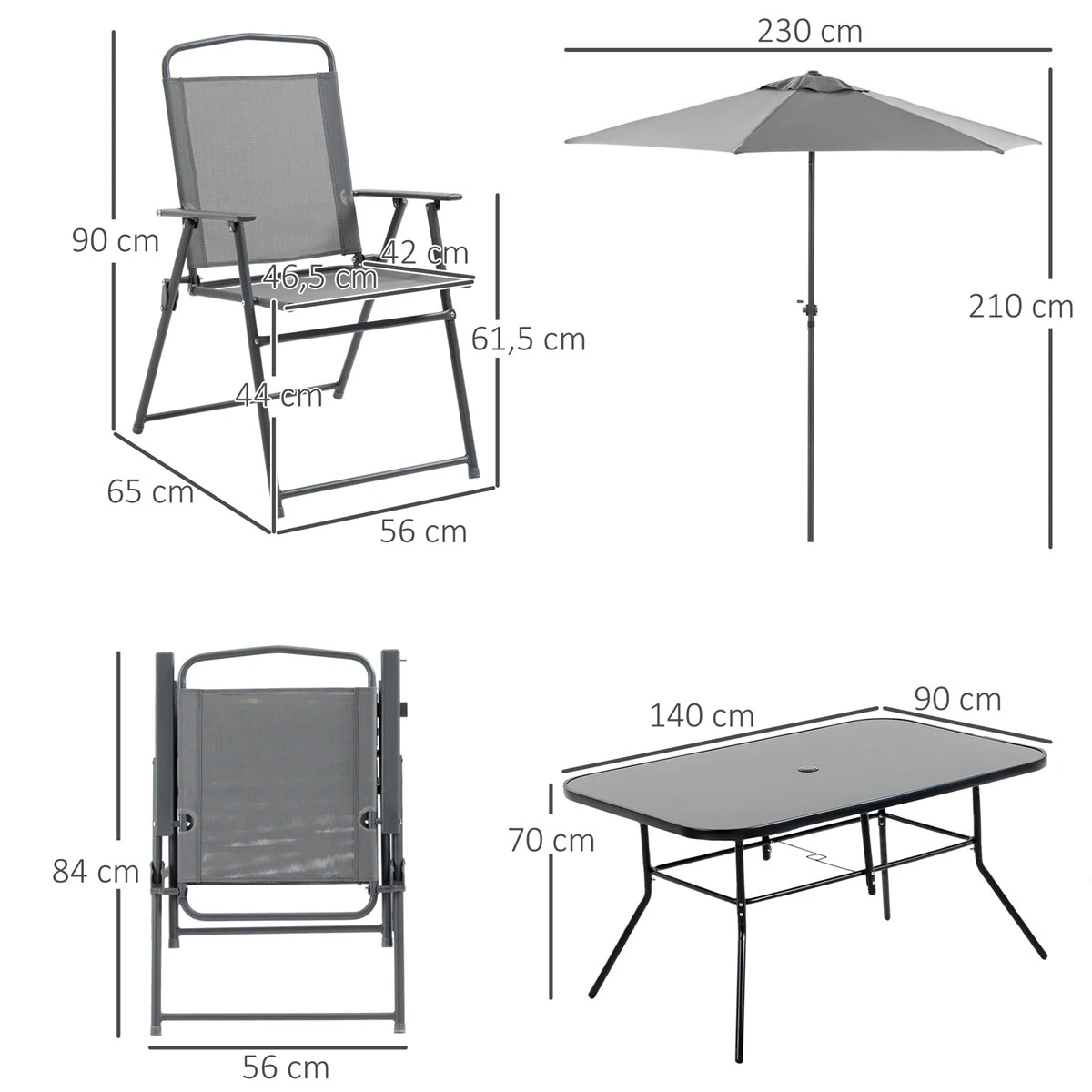 Tomar un aperitivo o cenar al aire libre es una gozada cuando hace buen tiempo. Pero lo es mucho más si tienes el espacio adecuado para ello. En este sentido, Outsunny te ofrece un conjunto de jardín para que no tengas que preocuparte de nada. Con estructura de metal, el poste de la sombrilla es reclinable, la mesa tiene la encimera de cristal y las sillas tienen el asiento y respaldo de malla transpirable. Características – Estructura metálica con recubrimiento en polvo para mayor resistencia a la oxidación y a la intemperie – Sillas con respaldo y asiento de malla transpirable, para ofrecer un asiento cómodo y que no se recaliente en exceso en verano – Sillas plegables para poderlas guardar fácilmente y ahorrar espacio – Ideal para su uso al aire libre, en jardines, patios y terrazas – Requiere montaje Especificaciones – Color: gris – Material: metal, vidrio templado, malla y poliéster – Medidas de la mesa: 140x90x70 cm (LxANxAL – Medidas de la silla: 65x56x90 cm (desplegada, 84x56x5 cm (plegada – Medidas de la sombrilla: Ø230×210 cm (abierta, 12x12x126 cm (plegada – Medidas del asiento: 46,5x42x44 cm (LxANxAL – Medidas del respaldo: 54×46 cm (LxAL – Orificio de la mesa para la sombrilla: Ø51 mm – Carga máxima: 70 kg (mesa, 114 kg (silla – Certificaciones: EN581-1-2 – Referencia: 84B-693V01GY