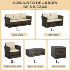 - – CONJUNTO DE 6 PIEZAS DE JARDÍN: Juego de muebles de jardín con asiento para 7 personas. Está compuesto por un sofá doble, un sofá triple, 2 butacas individuales y 2 mesitas, una de centro y otra auxiliar. Ideal para instalar en el porche de tu jardín, patio, junto a la piscina, etc. – MESAS CON ALMACENAJE: Tanto la mesa de centro como la mesa auxiliar disponen de espacio de almacenaje en su interior. Para que puedas guardar diferentes artículos, entre ellos los propios cojines del conjunto de jardín de 7 plazas. Cuentan con pestillo y resorte de gas para facilitar su apertura y cierre – RESISTENTE Y ESTABLE: Conjunto de sofás de exterior construido con un marco de metal con recubrimiento en polvo, ofrece una gran resistencia a la intemperie, a la oxidación y la corrosión. Acabado en polipropileno símil ratán, también resistente a los rayos UV y a estar expuesto al aire libre – COJINES CÓMODOS: Este conjunto de sofás de ratán incluyen los gruesos cojines del respaldo y del asiento que aseguran una experiencia cómoda de sentado. Las fundas de los cojines son extraíbles y se pueden lavar – MEDIDAS TOTALES: 183x72x77 cm (sofá triple, 128x72x77 cm (sofá doble, 72x72x77 cm (sillones, 120x60x40 cm (Mesa de centro y 70x70x64 cm (mesa auxiliar. Peso máximo soportado: 160 kg (cada asiento, 70 kg (mesa de centro y 50 kg (mesa auxiliar. Requiere montaje