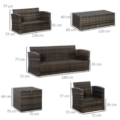 Dale vida a tu espacio exterior con este conjunto de mobiliarios de ratán para jardín de Outsunny. Con capacidad para 7 personas, es ideal para reunirse con la familia y amigos. Está compuesto por 4 sofás, 2 individuales, 1 doble y 1 triple. Y tiene dos mesas, ambas con espacio de almacenaje en su interior. Una gran opción para moblar tu jardín, terraza, patio, etc. Características – Conjunto de muebles de jardín con estructura de metal y ratán sintético de polipropileno (PE – Con cojines acolchados gruesos para un confort óptimo – Con capacidad para hasta 7 personas al mismo tiempo – Diseño clásico que combina con cualquier decoración de interior y exterior – La mesa de té y la mesa auxiliar a la vez hacen la función de baúl de almacenamiento – Fundas de cojines con cremallera para facilitar su limpieza – Requiere montaje Especificaciones – Color: marrón y beige – Material: ratán PE, metal galvanizado y poliéster – Medidas del sofá triple: 183x72x77 cm (LxANxAL – Medidas del sofá doble: 128x72x77 cm (LxANxAL – Medidas de los sillones: 72x72x77 cm (LxANxAL – Medidas de la mesa de centro: 120x60x40 cm (LxANxAL – Medidas internas de la mesa de centro: 116x56x35 cm (LxANxAL – Medidas de la mesa auxiliar: 70x70x64 cm (LxANxAL – Medidas internas de la mesa auxiliar: 66x66x59 cm (LxANxAL – Grosor de los cojines: 6,5 cm (asiento y 15 cm (respaldo – Carga máxima: 160 kg (cada asiento, 70 kg (mesa de centro y 50 kg (mesa auxiliar – Certificaciones: EN581-1-2 – Referencia: 860-120BG