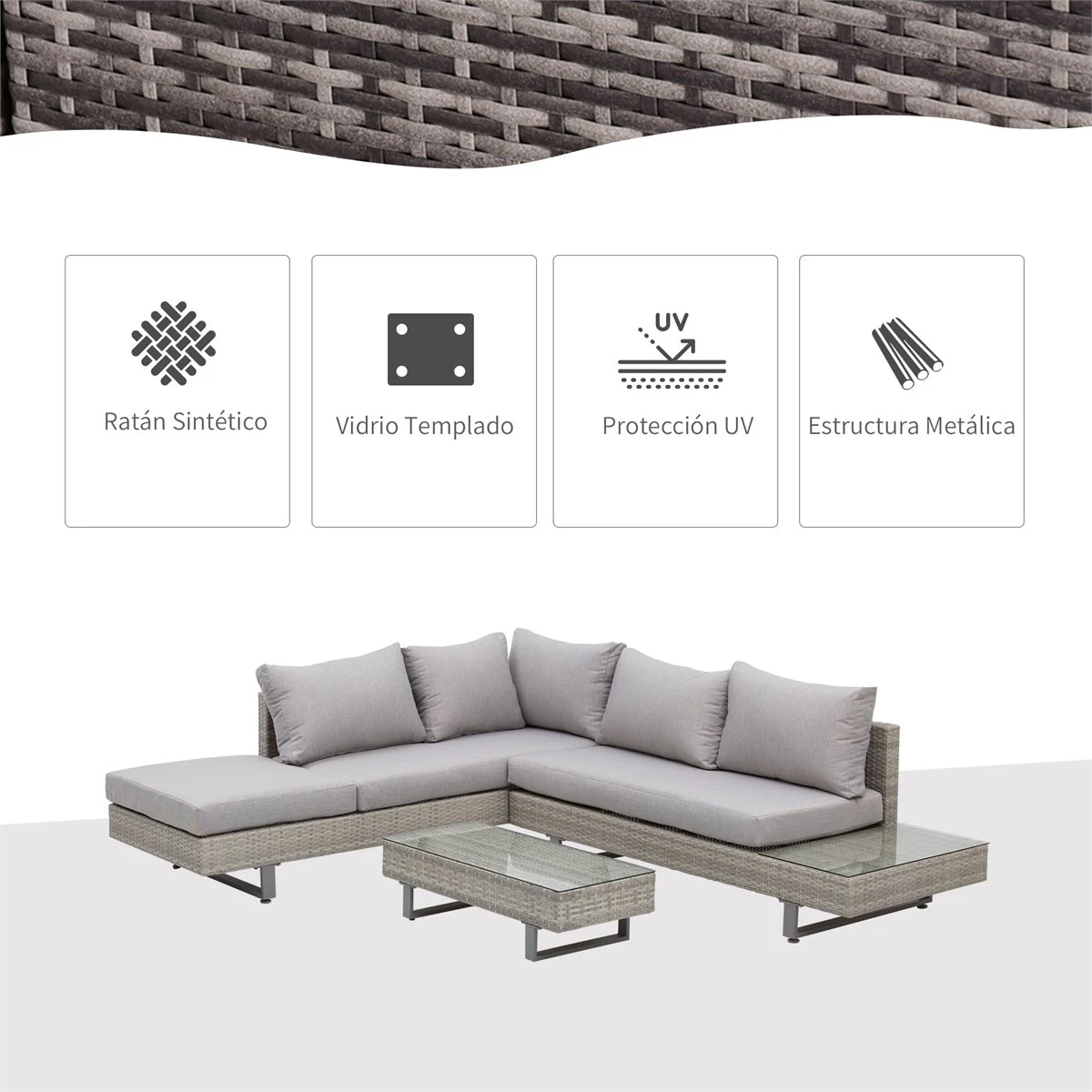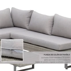 - – CONJUNTO DE RATÁN PARA EXTERIORES: Set de jardín formado por una esa de centro y un sofá esquinero compuesto por dos módulos, uno de 3 plazas y otro con 2 plazas y una mesa lateral ideal para tener a mano tu vaso, libro, teléfono, etc. – ESTRUCTURA RESISTENTE: Este conjunto de muebles para exterior está hecho de acero con recubrimiento en polvo y mimbre de PE. Las patas, sin ratán, ofrecen un estilo más elegante y cuentan con pies ajustables – COJINES CON FUNDAS LAVABLES: Las fundas de los cojines de este conjunto, además de presentar gran resistencia a la intemperie y a la decoloración, son extraíbles mediante cremallera y se pueden lavar, facilitando de este modo su mantenimiento – MODERNO Y CÓMODO: Su bonito diseño actual y confortable, lo hace ideal para colocar en cualquier espacio exterior como tu jardín, patio o terraza. Los asientos con respaldo y los cojines con acolchado extra de este sofá esquinero invitan a descansar y relajarse en él – MEDIDAS TOTALES: Medidas del sofá triple: 196x69x59 cm (LxANxAL; Medidas del sofá doble: 167x69x59 cm (LxANxAL; Medidas de la mesa: 90x40x25 cm (LxANxAL