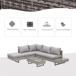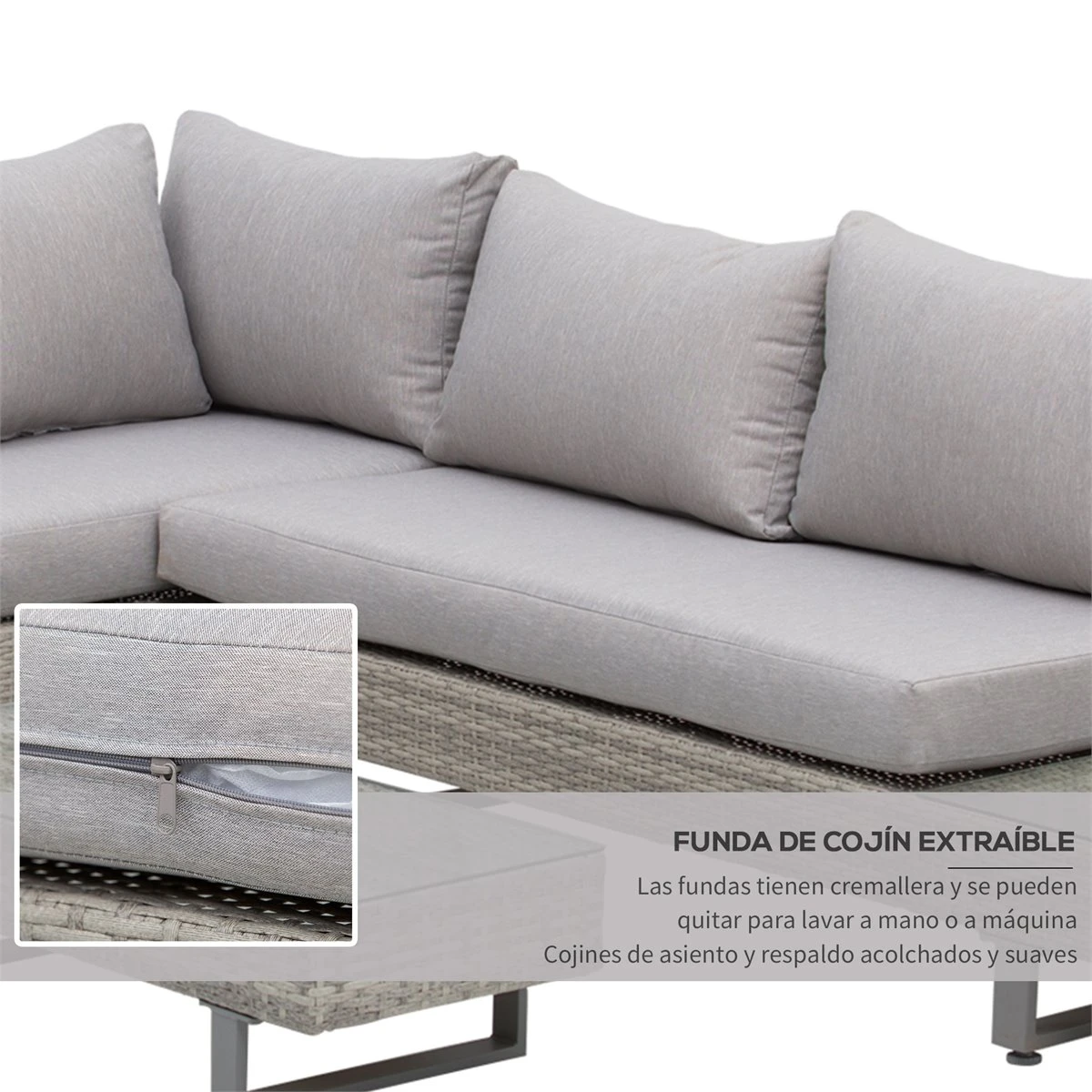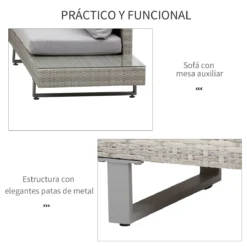 Si quieres darle un air nuevo a tu jardín o crear por primera vez una zona de relax en la terraza de casa, no puedes dejar pasar este conjunto de ratán de Outsunny. Cuenta con espacio suficiente para que se sienten cómodamente 5 personas, y 2 mesas, una de centro y una en uno de los lados del módulo de 2 asientos. Características – Elegante conjunto de jardín de muebles de ratán compuesto por una mesa de centro y sofá esquinero formado por un módulo de 3 plazas y otro de 2 con una mesa lateral – Estructura de acero con revestimiento en polvo para mayor resistencia a la intemperie y a la corrosión y cubierto de ratán PE – Incluye conjunto de cojines con fundas con cremallera extraíbles y lavables – Las patas de las 3 piezas, sin estar cubiertas de ratán, ofrecen gran estabilidad y ofrecen un aspecto aún más elegante al conjunto – Las patas cuentas con pies ajustables y antideslizantes para proteger el suelo y poder estabilizar el sofá incluso en suelos con irregularidades – Para jardín, terraza, patio o cualquier otro espacio exterior al aire libre – Se requiere montaje Especificaciones – Color: gris – Material: acero, ratán PE y poliéster – Medidas del sofá triple: 196x69x59 cm (LxANxAL – Medidas del sofá doble: 167x69x59 cm (LxANxAL – Medida de la mesa de centro: 90x40x25 cm (LxANxAL – Medidas del asiento del sofá doble: 127×60 cm (LxAN – Medidas del asiento del sofá triple: 188×60 cm (LxAN – Medida de la mesa lateral: 40×69 cm (LxAN – Carga máxima: 30 kg (mesa y 160 kg (cada sofá – Referencia: 860-143