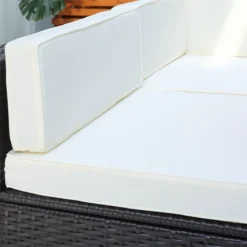 - – MATERIAL DE ALTA CALIDAD: Estructura de acero envuelto en ratán PE. Resistente y duradero. – DISEÑO VERSÀTIL: Este conjunto de muebles de ratán de Outsunny consta de 7 piezas. En estas hay: 2 sofás de esquina, 4 sofás sin brazos y 1 mesa de café. Los sofás incorporan cojines y almohadas, para una mayor comodidad. Puedes organizarlos según tus necesidades. – MODERNO: sofá ratán con líneas contemporáneas, limpias y elegantes que crean una pieza central moderna para cualquier ambiente exterior. El acabado de ratán marrón café complementa con estilo los cojines de color blanco crema, mientras que las dos almohadas decorativas rojas agregan un toque de color. – DISEÑO: Diseño moderno, combina perfectamente con cualquier decoración. El ratán es de color marrón café y los cojines de color blanco crema. Para romper con los colores neutros de los muebles, incluye dos almohadas rojas. – COMODIDAD Y FUNCIONALIDAD: Los asientos son bajos y con una gran profundidad. Los cojines son gruesos y cómodos. Además, incorporan unas hebillas para fijarlos, y así evitar que se muevan. Puedes quitar las fundas de los cojines fácilmente para limpiar.