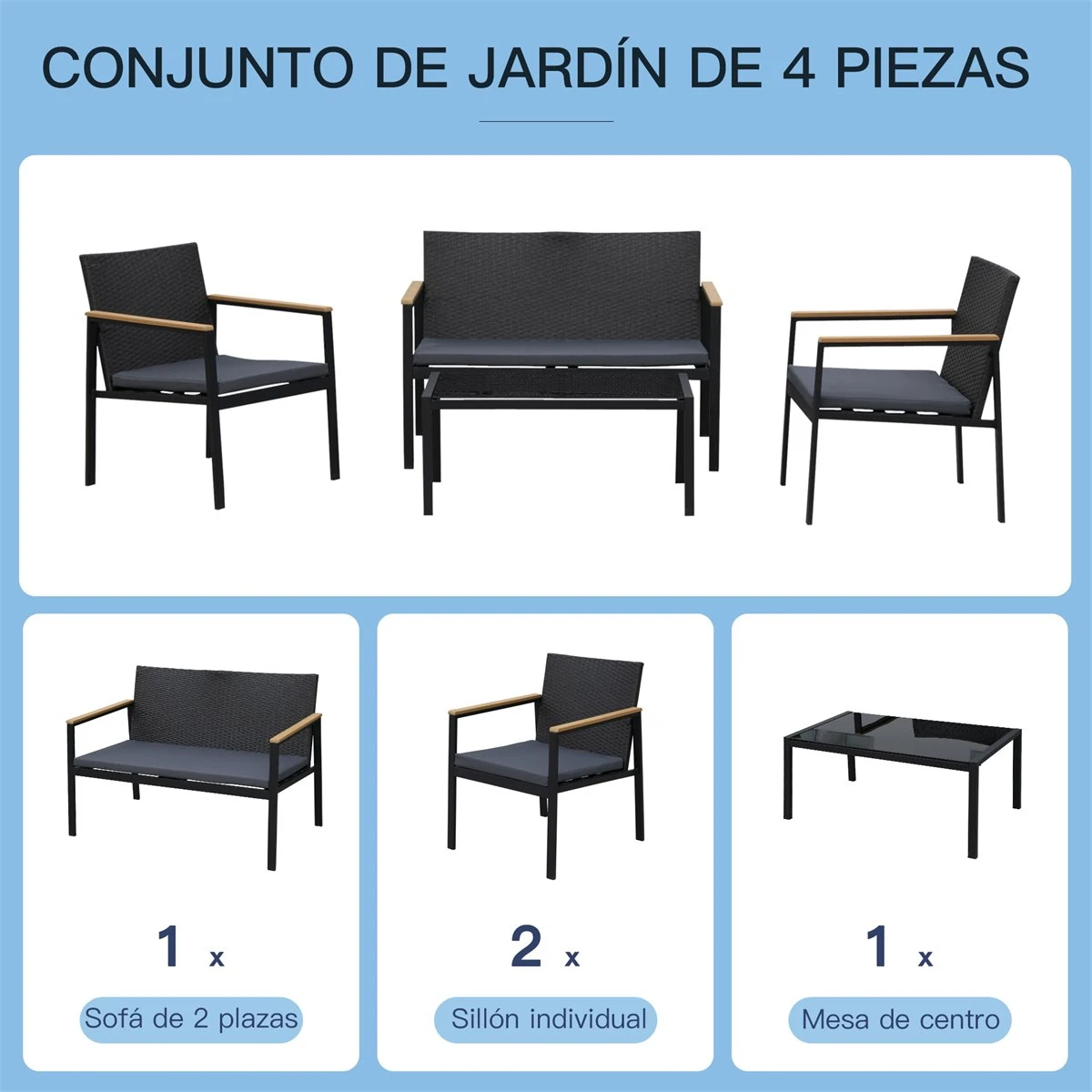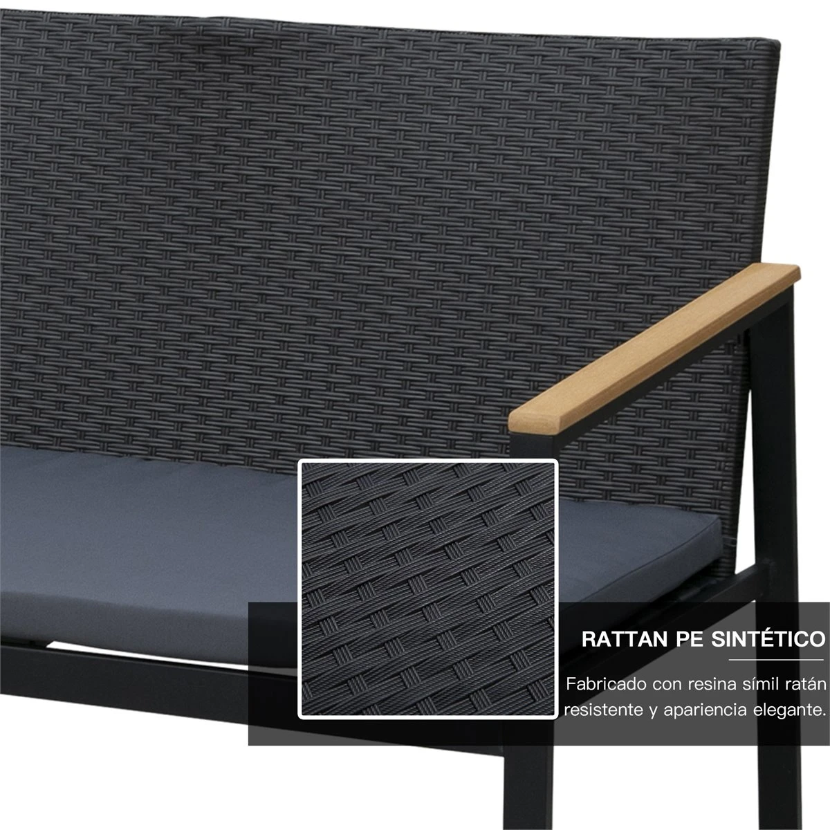 No te compliques demasiado para tener un salón de exterior. Este conjunto de 4 piezas para salón exterior de Outsunny te da la clave para sacarle el máximo partido a tu terraza, patio o jardín. Incluye 2 sillones, 1 sofá y una mesa de centro, por lo que nada más recibirlo y montarlo tendrás un salón de exterior completo. Este conjunto de 4 piezas para salón exterior es la solución ideal para tener un salón al aire libre sin dejarte una fortuna. No lo dudes más y no lo dejes escapar. Características – Conjunto de muebles de ratán para exterior. Incluye un sofá, una mesa de centro y 2 sillones – Materiales aptos para su uso a la intemperie – Diseño moderno y elegante – Ideal para patios, jardines, balcones, terrazas, etc. – Materiales fáciles de mantener siempre a punto, ya que se pueden limpiar con un paño húmedo – Los cojines se pueden lavar – Incorporan protectores antideslizantes que además protegen el suelo de arañazos – Instrucciones de montaje incluidas – Requiere Montaje Especificaciones – Colores: Ratán Negro y Cojines Grises – Color del Reposabrazos: Madera Natural – Materiales: Acero, Ratán de PE, Algodón y Polywood – Tamaño de cada sillón: 58x66x75 cm (LxANxAL. Medida de los asientos: 50×48 cm (LxAN – Tamaño del sofá: 108x66x75 cm (LxANxAL. Medida del asiento: 100×48 cm (LxAN – Altura de los asientos: 35cm – Tamaño de la mesa de centro: 80x42x37 cm (LxANxAL – Peso máximo que soportan: 160kg/por asiento, 75kg/mesa – Peso Neto: 27kg – Referencia: 860-092