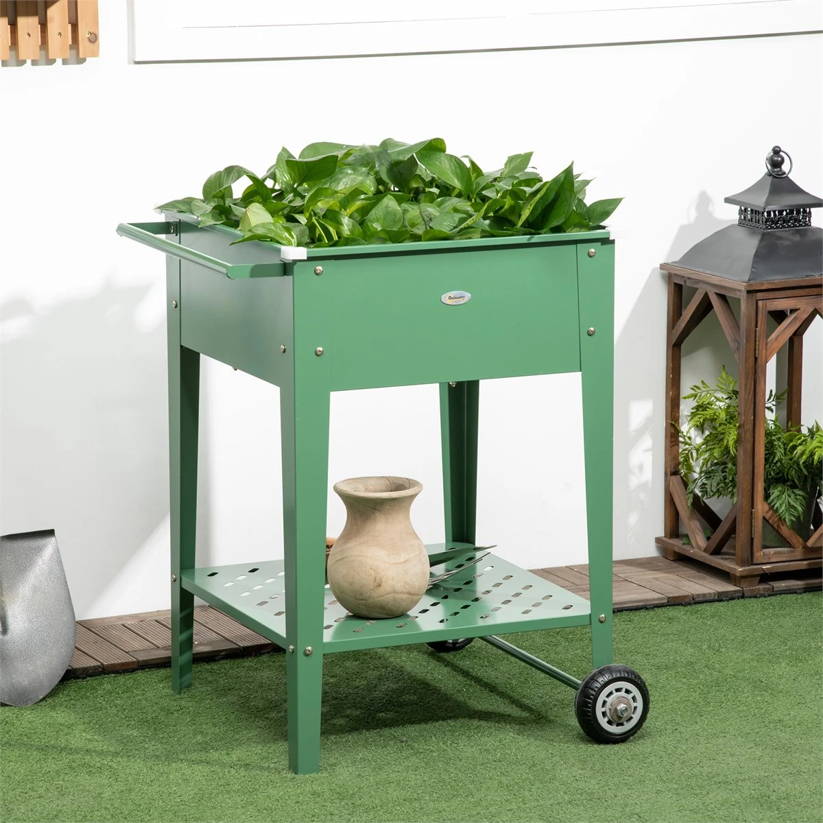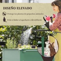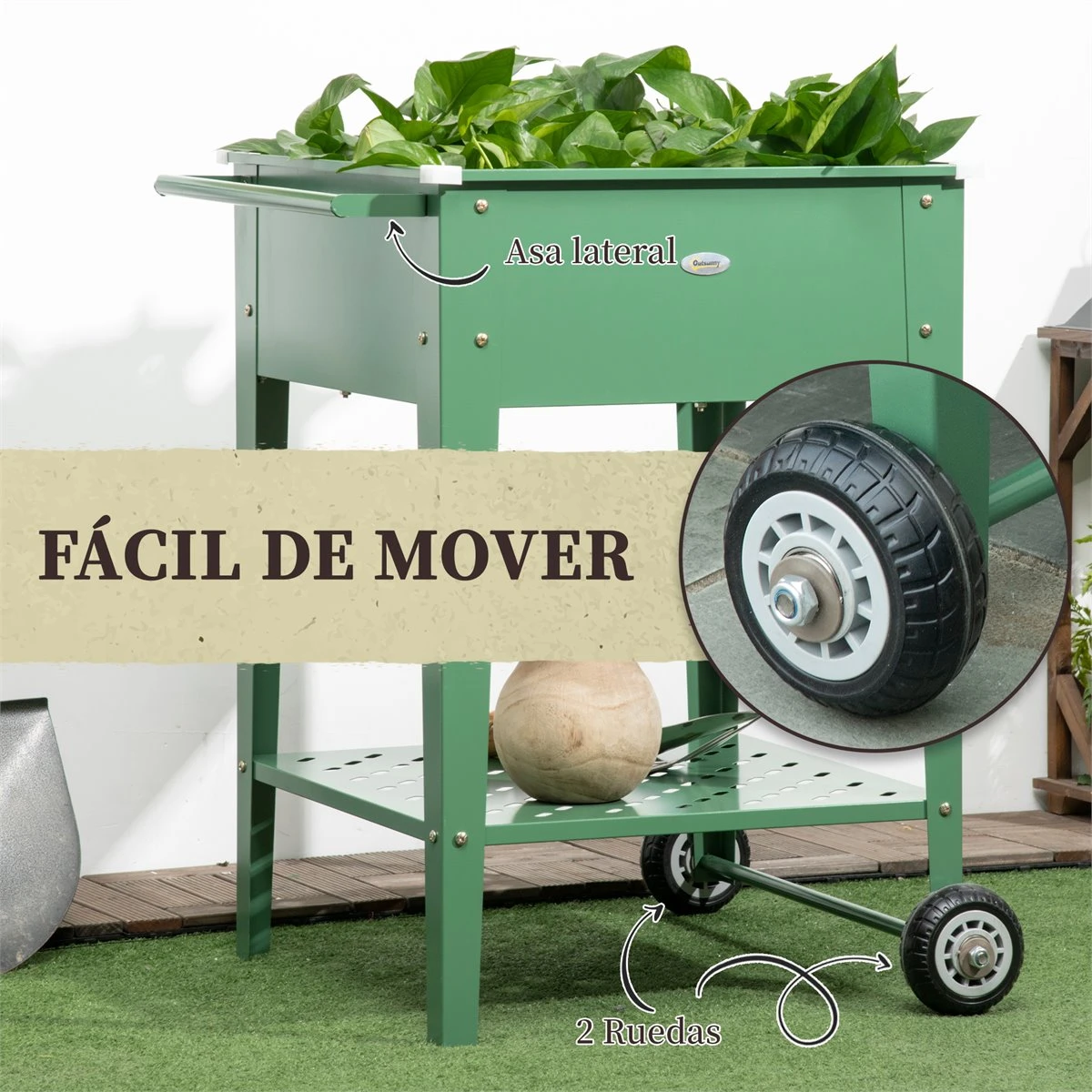 ¿Te aquejas de dolor de espalda y te encantas las plantas? Entonces esta jardinera elevada de Outsunny con ruedas es ideal para ti. Decorativa y a la vez pensada para facilitar su uso y transporte. Es ideal para evitar malas posturas. Tiene un estante inferior para poder tener todas las herramientas a mano y ruedas y un asa lateral para mover sin esfuerzo. Y no debes preocuparte por el exceso de agua y transpirabilidad de tus plantas, ya que tiene un orificio de drenaje en la parte inferior. Características: Jardinera elevada que evita malas posturas y proporciona mayor comodidad de uso Amplio espacio para tener tus plantas, flores, etc. Estante inferior para colocar herramientas, macetas, y más, con pequeñas perforaciones para evitar la acumulación de agua Orificio para drenar el exceso de agua Con 2 ruedas y asa lateral, para mover con facilidad Con 4 protectores de esquina para proteger de lesiones y golpes accidentales Fabricado con acero galvanizado resistente a la oxidación con superficie tratada especial para mayor estabilidad Ideal para usar en tu patio, terraza, jardín y más Se requiere montaje Especificaciones: Color: verde Material: acero galvanizado Medidas totales: 64x55x79 cm (LxANxAL Medidas del área de plantación: 52x52x21 cm (LxANxAL Medidas del estante inferior: 52x52x20 cm (LxANxAL Carga máxima: 50 kg (área de plantación, 30 kg (estante Referencia: 845-845V00GN