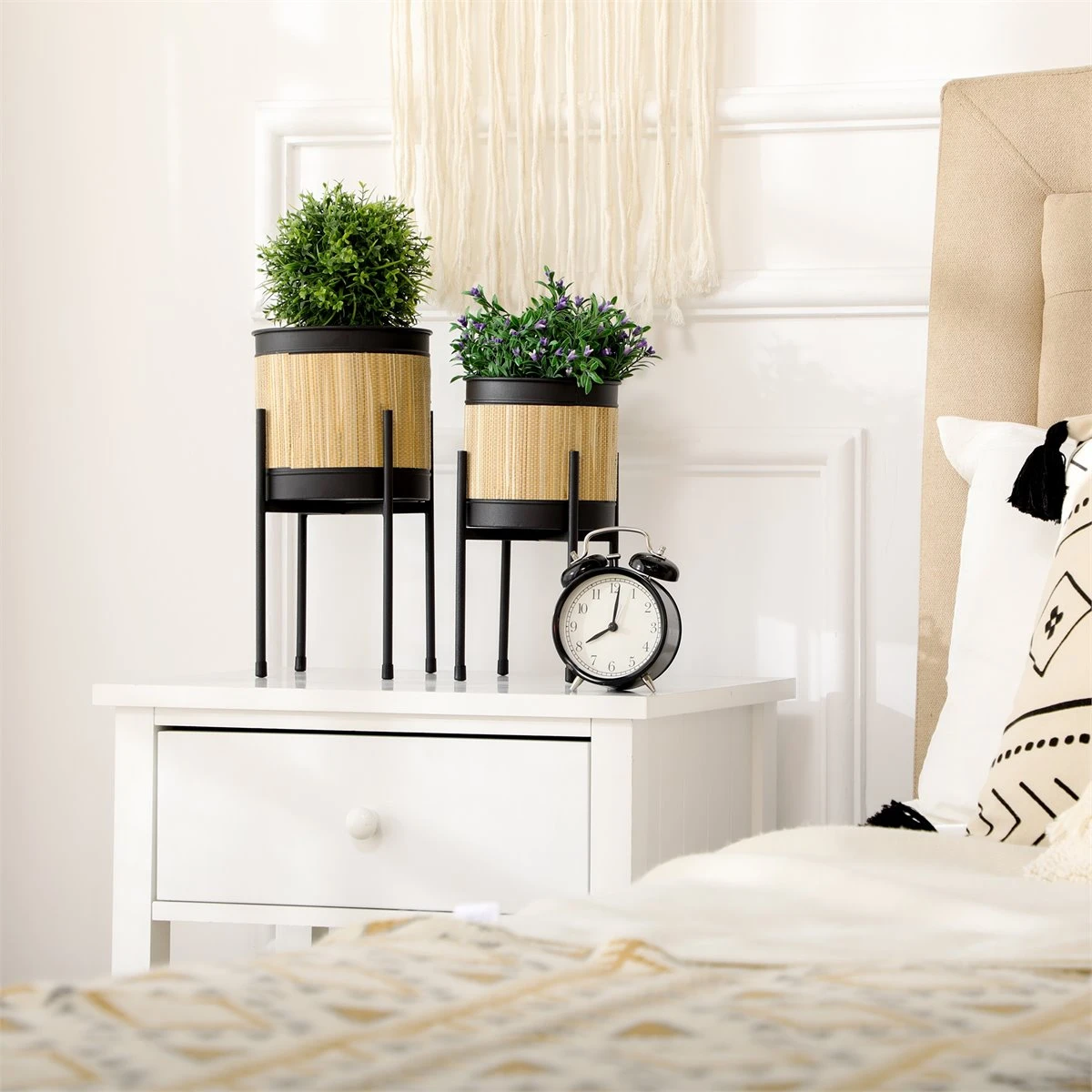 ¡Dale un toque especial a tu hogar con estos bonitos maceteros! Este juego es perfecto para resaltar tus plantas, creando un toque de sofisticación en tu decoración. Con un diseño elegante y rústico, combinando fibra vegetal tejida a mano con metal, este conjunto hará aún más acogedores tus ambientes. ¡Transforma cualquier habitación en un espacio elegante y encantador con estos dos soportes para plantas tan originales! Características – Bonito juego de maceteros de dos tamaños diferentes – Añade un toque elegante a la decoración de tu hogar exponiendo tus plantas con estilo – Fabricado con estructura metálica para mayor estabilidad – No tiene orificios de drenaje en la parte inferior – Adecuado para sala de estar, comedor, dormitorio, etc. – Requiere montaje rápido y fácil Especificaciones – Color: negro – Material: metal y fibra vegetal (totora – Medidas totales: Ø16×30 cm y Ø14 25,5 cm – Profundidad de las cestas: 4,8 cm y 12,5 cm – Altura de las patas: 23 cm/ 19,5 cm – Referencia: 845-832V00BK