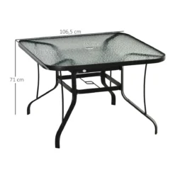 ¿Estás preparando tu terraza o jardín para la llegada del buen tiempo? Entonces esta mesa de jardín cuadrada de Outsunny con encimera de cristal te encantará. Conjúntala junto a tus sillas si ya tienes o hazte con unas te gusten. Combinarlas con la mesa será tarea fácil, ya que su estructura de acero de color negro y la encimera de cristal templado ondulado combinan con casi cualquier cosa. Además, tiene un agujero para que puedas poner en medio la sombrilla. Características – Encimera de vidrio templado grueso para mayor seguridad – Superficie de la encimera con fino relieve de ondas de agua que recuerdan el movimiento del mar – Estructura de acero curvado con bordes redondeados – Con un orificio en el medio apto para sombrillas con postes de 38 mm de diámetro – Ideal para su uso en exteriores como jardín, patio o terraza – Se limpia fácilmente con un paño húmedo – Con gran capacidad de carga, puede soportar hasta 45 kg – Requiere montaje Especificaciones – Color: negro – Material: acero y vidrio templado – Medidas totales: 106,5×106,5×71 cm (LxANxAL – Diámetro del orificio para la sombrilla: Ø38 mm – Carga máxima: 45 kg – Referencia: 84B-774
