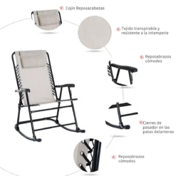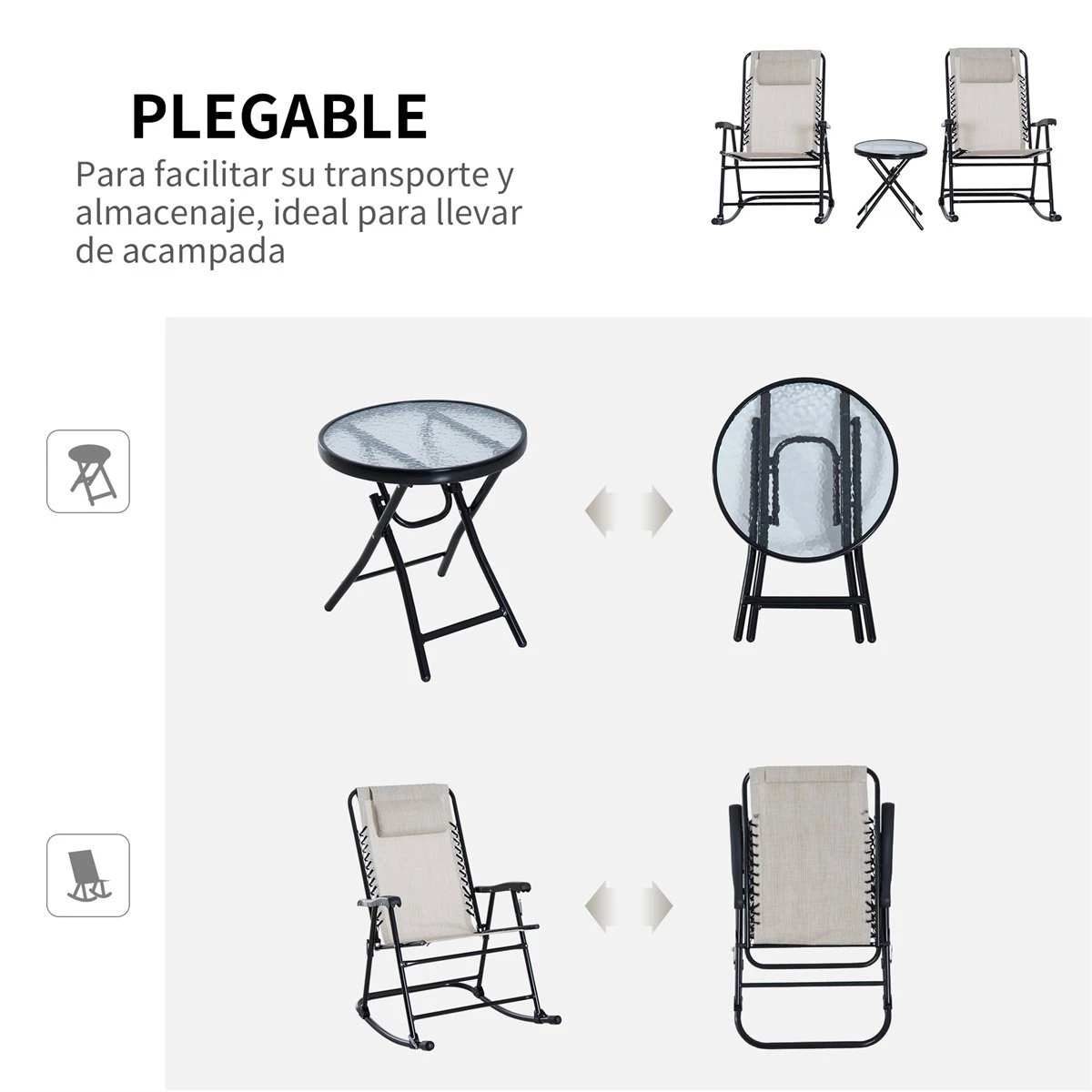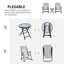 Si quieres huir de los muebles tradicionales, Outsunny te ofrece un moderno conjunto compuesto por una pequeña mesa auxiliar de centro y dos mecedoras. Sí, sí… como lo has oído, para que puedas balancearte mientras te relajas tomando en sol o bajo la sombra en tu jardín o terraza. Además, las 3 piezas son plegables para poder mover y guardar con facilidad. Las mecedoras cuentas con un cojín reposacabezas y tienen apoyabrazos. Para que te relajes mientras tomas un refresco solo o en compañía. Características – Conjunto de 3 piezas compuesto por 1 mesa auxiliar y 2 sillas mecedoras – Ideal para tu jardín, terraza o espacio reducido al aire libre – Tumbonas con estructura de acero y tejido de malla transpirable de alta calidad garantizar un uso prolongado – Mesa pequeña de centro con estructura de acero y encimera con vidrio templado – Las 2 mecedoras plegables tienen reposabrazos ideales para descansar relajadamente – Con reposacabezas acolchado grueso para mayor comodidad – Diseño plegable para un fácil almacenaje y transporte Especificaciones – Color: beige – Material: acero y tejido de PVC – Medidas de la mesa: Ø46×49 cm (DiámxAL – Medidas de la mecedora: 68x90x106 cm (LxANxAL – Medidas del asiento: 59x48x54 cm (LxANxAL – Medidas plegadas de la mesa: 46x66x6 cm (LxANxAL – Medidas plegadas de la mecedora: 68x118x16 cm (LxANxAL – Carga máxima: 120 kg (silla y 40 kg (mesa – Referencia: 84B-202CW