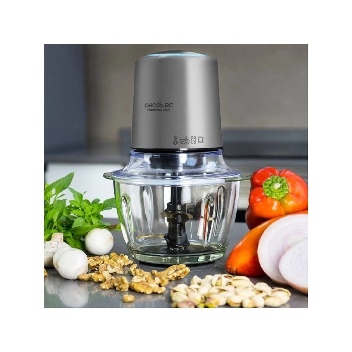 Picadora eléctrica compacta para todo tipo de alimentos.Cuerpo de acero inoxidable.Bol de cristal de alta calidad con 1 litro de capacidad.Cuchillas con recubrimiento de titanio que mejora la dureza y mantiene el afilado por más tiempo.Cuchillas desmontables. Posibilidad de usarlas con 2 o 4 hojas con diferentes alturas.Pica y pulveriza hielo en segundos. 400 W de potencia. Sistema ControlSpeed: regula la velocidad según la presión con la que se pulse el botón.Piezas no eléctricas aptas para el lavavajillas. Fácil de desmontar y limpiar. Base antideslizante y hueco recogecables. PicadoraBol de cristalCuchillas desmontablesManual de instrucciones