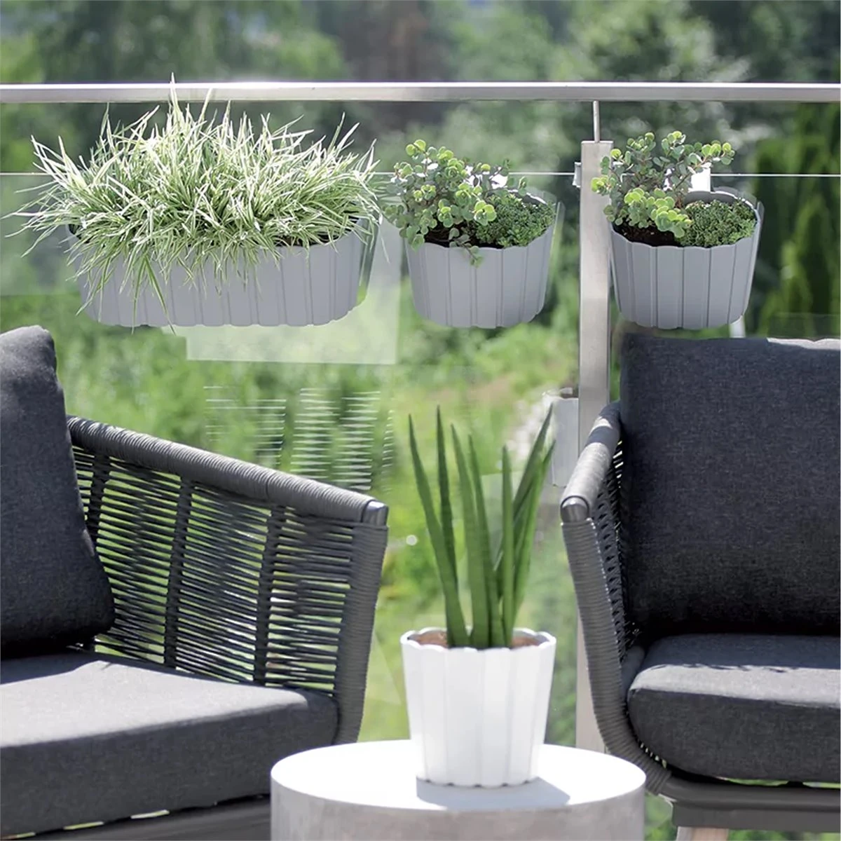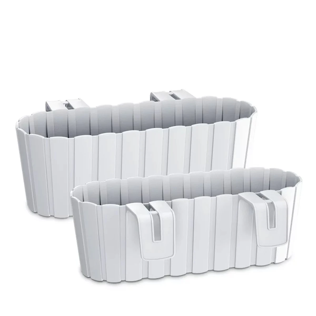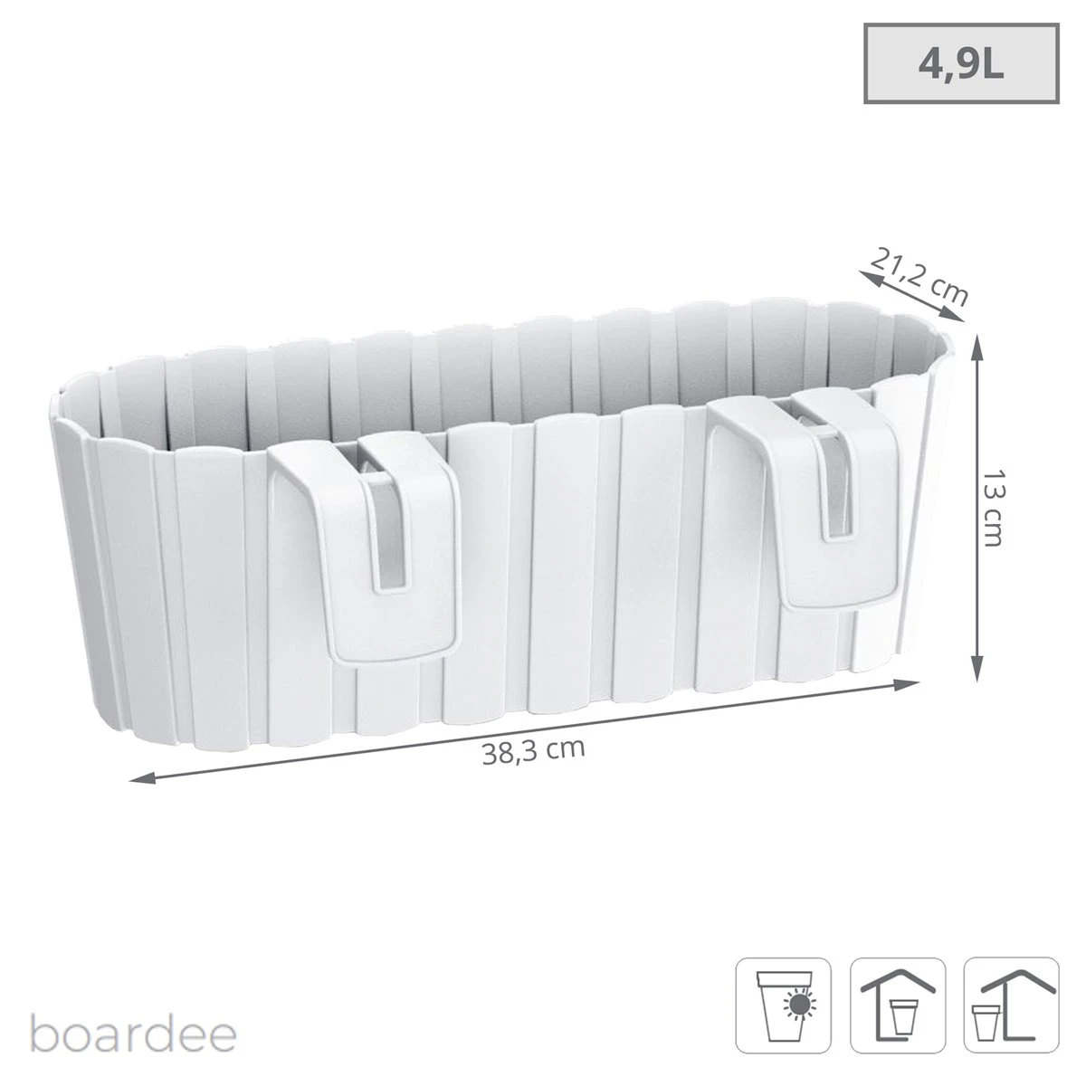 Jardinera para balcón de la colección BOARDEE HOOKDimensiones: 383x212x130BlancoIncorpora ganchos para sujetarse firmemente a barandillas
