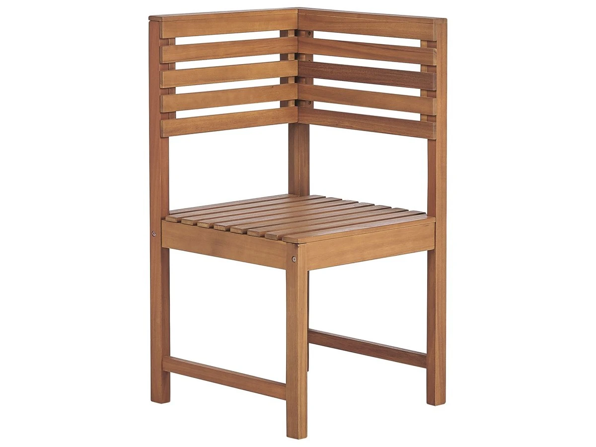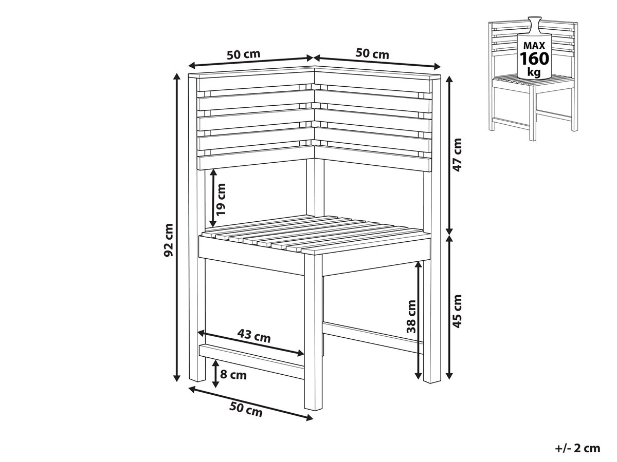 Rinconera de madera de acacia. Esta sección esquinera o rinconera para exterior es ideal para cualquier lugar de descanso de dimensiones reducidas. Los distintos elementos modulares a juego (una mesa, un asiento y un banco se pueden configurar de la forma que se desee. Está fabricada de madera de acacia resistente y duradera. Combínala con plantas en macetas y dale a tu terraza un aire distinto. Detalles: Tipo de Producto: Silla de jardín Estilo: Boho Color: Madera clara Tipo de material: Madera maciza Material principal: Madera de acacia Material de las patas: Madera maciza Material del asiento: Madera maciza Apoyabrazo: No Acabado: Aceitado Plegable: No Apilable: No Dimensiones: Profundidad: 50 cm Altura del asiento: 45 cm Ancho: 50 cm Altura: 92 cm Superficie del asiento: 50×50 cm Peso: 9 kg Capacidad de peso: 160 kg La oferta incluye: 1 x Módulo de esquina Ventajas: Colores cálidos y elegantes, Los nudos y vetas de madera natural hacen que cada pieza sea única, Materiales pensados para el uso en el exterior, Varias posibilidades de ubicación Información de montaje: Requiere montaje completo. 20-40 min. Información adicional: El producto viene con un libro de cuidados detallado para ayudarte a mantener tus muebles en las mejores condiciones durante muchos años. Consulta estos consejos para garantizar el mantenimiento adecuado de tus muebles nuevos – encontrarás las instrucciones de mantenimiento junto con el manual de montaje. Texto de resistencia: Gracias a su resistencia al agua, puedes utilizar el producto al aire libre y dejarlo a la intemperie durante lluvias ligeras. Si no es posible guardarlo en un lugar cerrado y protegido, recomendamos utilizar una funda protectora. La exposición prolongada a la humedad puede provocar daños en el mueble. Resistencia: Agua ligera / humedad Consejos de mantenimiento: Madera de acacia: 1.Limpiar con un limpiador suave y un paño suave en la dirección de la veta. Secar con un paño inmediatamente después de limpiar 2.Durante el invierno o en condiciones climáticas adversas, utilice una funda protectora o guarde los muebles en el interior 3.Los muebles con acabado de aceite deben volverse a engrasar antes de ponerlos en uso y al menos una vez al año, especialmente en el clima húmedo.