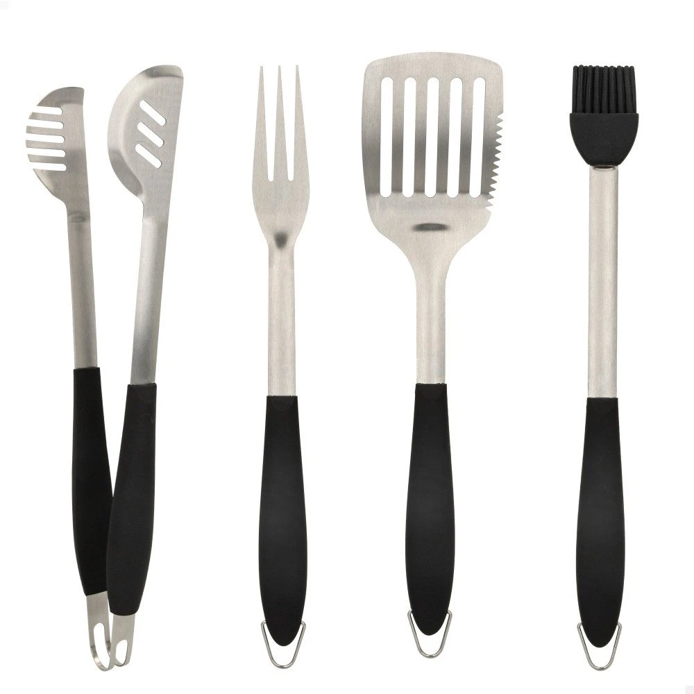 Set de utensilios para barbacoa Aktive Barbecue compuesto por unas pinzas, un tenedor trinchador, una espátula con cuchilla lateral para cortar y un pincel para embadurnar. Los accesorios están fabricados de acero inoxidable color gris con mango ergonómico de goma color negro, ideales para cocinar en una parrilla, ya que el acero inoxidable es resistente al calor y al óxido, mientras que el mango de goma proporciona un agarre cómodo y seguro para evitar quemaduras. Asimismo, las pinzas incorporan un orificio y la espátula, el tenedor y el pincel una anilla en el extremo del mango para colgarlos fácilmente y tenerlos al alcance de la mano de manera instantánea. Un set de utensilios especialmente diseñado para cocinar los alimentos de manera segura y eficiente sobre la parrilla.