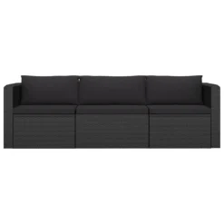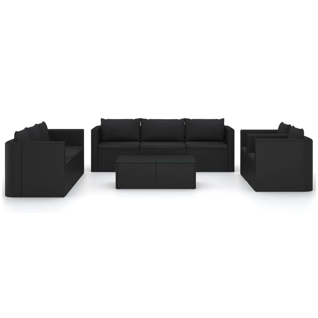 Crea la zona de estar atractiva y relajante con la que siempre has soñado con este juego de sofás para jardín. ¡Puedes disfrutar de una relajante tarde soleada o de una noche veraniega con tu familia y amigos en este juego de muebles modular! Construido a partir de duradero ratán PE tejido a mano sobre una estructura de acero con recubrimiento en polvo, este conjunto es fuerte, resistente a la intemperie y adecuado para usar a diario. Los cojines acolchados y gruesos y los asientos modernos extraprofundos harán que puedas relajarte. Las fundas de los cojines, con cremallera, son extraíbles para facilitar el lavado. La superficie de la mesa de centro incluye un cristal templado endurecido para dar un toque de estilo y facilitar la limpieza. Además, gracias a su diseño ligero y modular, puedes mover este conjunto por tu casa con gran facilidad. Nota: Se recomienda cubrir el set en caso de lluvia, nieve y heladas. Nota: Para prolongar la vida útil de los muebles de exterior, te recomendamos que los limpies con regularidad y no los dejes al aire libre sin protección innecesariamente.Limpia: Usa una solución de jabón suaveAlmacenamiento: Si es posible, guárdalos en un lugar fresco y seco en el interior. Si el producto se almacena al aire libre, protégelo con una funda impermeable. Limpia y seca el exceso de agua o nieve de las superficies planas después de una lluvia o nevada. Permite la ventilación para evitar daños relacionados con la humedad. Color: NegroColor cojín: NegroMaterial: Acero con recubrimiento en polvo, ratán PEMaterial del cojín: PoliésterDimensiones de la mesa de centro: 50 x 60 x 33 cm (ancho x profundo x altoDimensiones del sofá central: 68 x 72 x 63 cm (ancho x profundo x altoDimensiones del sofá esquinero: 72 x 72 x 63 cm (ancho x profundo x altoDimensiones del sofá individual: 80 x 72 x 63 cm (ancho x profundo x altoGrosor del cojín: 6 cmGrosor de almohadas: 15 cmLa entrega incluye:2 x Mesas de centro con superficie de cristal templado4 x Sofás de esquina2 x Sofás individuales2 x Sofás centrales8 x Cojines de asiento8 x Cojines de respaldo