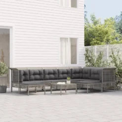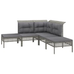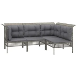 ¡Disfruta de un agradable café en el espacio al aire libre de la casa con este juego de muebles para jardín! Es un aporte perfecto para el jardín y la terraza, y crea además una impresión duradera. Material resistente a la intemperie: El ratán sintético es resistente a la intemperie y fácil de limpiar. La parte exterior se mantiene hermosa durante mucho tiempo. Es más económico que otros materiales, además de ofrecer una gran calidad, comodidad y aspecto estético.Estructura robusta y estable: La estructura de acero del conjunto de muebles garantiza su solidez y estabilidad.Cómodo asiento: El respaldo aporta un plus de comodidad al juego de muebles. Además, los cojines gruesos y acolchados proporcionan comodidad al asiento.Diseño modular: El juego de muebles de jardín es flexible y fácil de mover, por lo que puedes combinarlo con otros segmentos modulares de la tienda web para crear tus propias configuraciones personales de juegos de muebles para jardín. Nota:Para asegurarte de que tus muebles de exterior se mantengan hermosos, recomendamos protegerlos con una funda impermeable. Color: GrisColor de cojín: Gris oscuroMaterial: Ratán sintético, acero con recubrimiento en polvoSofá central:Dimensiones: 55 x 65 x 75 cm (ancho x profundo x altoAnchura del asiento: 55 cmProfundidad del asiento: 55 cmAltura del asiento desde el suelo: 32 cmDiseño de cuadrículaCapacidad de carga máxima: 110 kgSofá esquinero:Dimensiones: 65 x 65 x 75 cm (ancho x profundo x altoAnchura del asiento: 55 cmProfundidad del asiento: 55 cmAltura del asiento desde el suelo: 32 cmDiseño de cuadrículaCapacidad de carga máxima: 110 kgReposapiés: Dimensiones: 55 x 55 x 32 cm (ancho x profundo x altoDiseño de cuadrículaCapacidad de carga máxima: 110 kgCojín:Material: Tela (100% poliésterMaterial del relleno del cojín de asiento: EspumaMaterial del relleno del cojín de respaldo: Fibra de algodónDimensiones del cojín de asiento: 55 x 55 x 3 cm (ancho x profundo x grosorDimensiones del cojín de respaldo: 48 x 39 x 10 cm (ancho x profundo x grosor / 56 x 39 x 10 cm (ancho x profundo x grosorRequiere montaje: SíLa entrega incluye:4 x Sofás centrales3 x Sofá esquinero3 x Reposapiés10 x Cojines de asiento10 x Cojines traseros