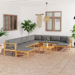 Este juego de jardín de madera, que destaca por su diseño elegante y sus cojines blandos, es un gran aporte para tu jardín, terraza o patio, para que puedas conversar con familiares y amigos o simplemente disfrutar del buen tiempo. Hecho de madera dura de teca muy duradera, este juego de muebles de teca ha sido curado, secado al horno y luego lijado para dar una apariencia muy suave. La madera de teca es conocida por su excepcional solidez y resistencia a la intemperie, lo que la hace mucho más adecuada para muebles de jardín que cualquier otro tipo de madera. La madera de teca es la elección perfecta si deseas comprar un mueble de jardín duradero. La superficie lijada es fácil de limpiar con un paño húmedo. El asiento y respaldo densamente acolchados, así como los reposapiés incluidos, aumentan la comodidad máxima. La mesa es ideal para colocar bebidas y comida. Nota: Para prolongar la vida útil de los muebles de exterior, te recomendamos que los limpies con regularidad y no los dejes al aire libre sin protección innecesariamente.Limpieza: Usa una solución de jabón suaveAlmacenamiento: Si es posible, guarda el producto en un lugar fresco y seco en el interior. Si el producto se almacena al aire libre, protégelo con una funda impermeable. Limpia y seca el exceso de agua o nieve de las superficies planas después de una lluvia o nevada. Permite la ventilación para evitar daños relacionados con la humedad. Color del cojín: GrisMaterial: Madera dura de teca lijada fina con acabado a base de agua, tela (100% poliésterDimensiones del sofá de la esquina: 66 x 66 x 60 cm (ancho x profundo x altoDimensiones del sofá del medio: 63 x 66 x 60 cm (ancho x profundo x altoDimensiones de la mesa: 63 x 63 x 30 cm (ancho x profundo x altoDimensiones del reposapiés : 62,5 x 62,5 x 30 cm (ancho x profundo x altoGrosor del cojín del asiento: 5 cmGrosor del cojín de respaldo: 15 cmRequiere montaje: SíLa entrega incluye:3 x Sofás de esquina5 x Sofás centrales1 x Mesa2 x Taburetes10 x Cojines de asiento11 x Cojines de respaldo