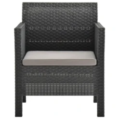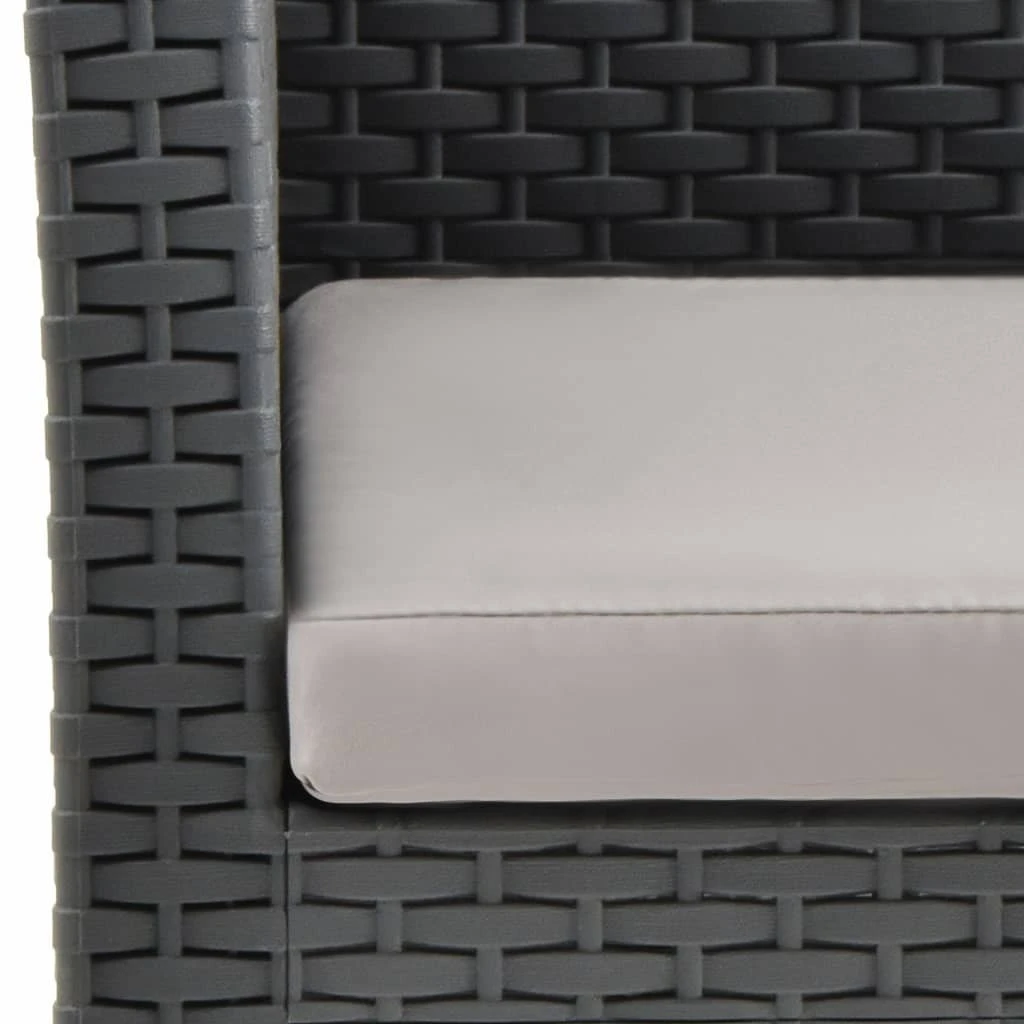 Disfruta de tu tiempo de relajación al aire libre con este juego de salón de jardín. Este set de muebles de jardín tiene una construcción ligera de polipropileno, lo que lo hace fácil de limpiar y adecuado para uso al aire libre. El cojín resistente a los rayos UVA incluido, el respaldo ergonómico y los reposabrazos redondeados brindan comodidad adicional al sentarse. La funda de cojín se puede quitar y lavar. Además, la mesa es ideal para colocar comida y bebida. Nota: Para prolongar la vida útil de los muebles de exterior, te recomendamos que los limpies con regularidad y no los dejes al aire libre sin protección innecesariamente.Limpieza: Usar una solución de jabón suaveAlmacenamiento: Si es posible, guarda el producto en un lugar fresco y seco en el interior. Si el producto se almacena al aire libre, protégelo con una funda impermeable. Limpia y seca el exceso de agua o nieve de las superficies planas después de una lluvia o nevada. Permite la ventilación para evitar daños relacionados con la humedad. Color: Gris antracitaMaterial: PP (Polipropileno con aspecto de ratánDimensiones del sofá: 240 x 65 x 76 cm (ancho x profundo x altoDimensiones de las sillas: 63 x 65 x 76 cm (ancho x profundo x altoDimensiones de la mesa: 58 x 58 x 41 cm (ancho x profundo x altoAltura del apoyabrazos desde el suelo: 61 cmAltura del asiento desde el suelo: 36 cmGrosor del cojín: 5 cmResistente a los rayos UVRequiere montaje: SíLa entrega incluye:1 x Sofá de 4 plazas2 x Sillas1 x Mesa6 x Cojines de asiento