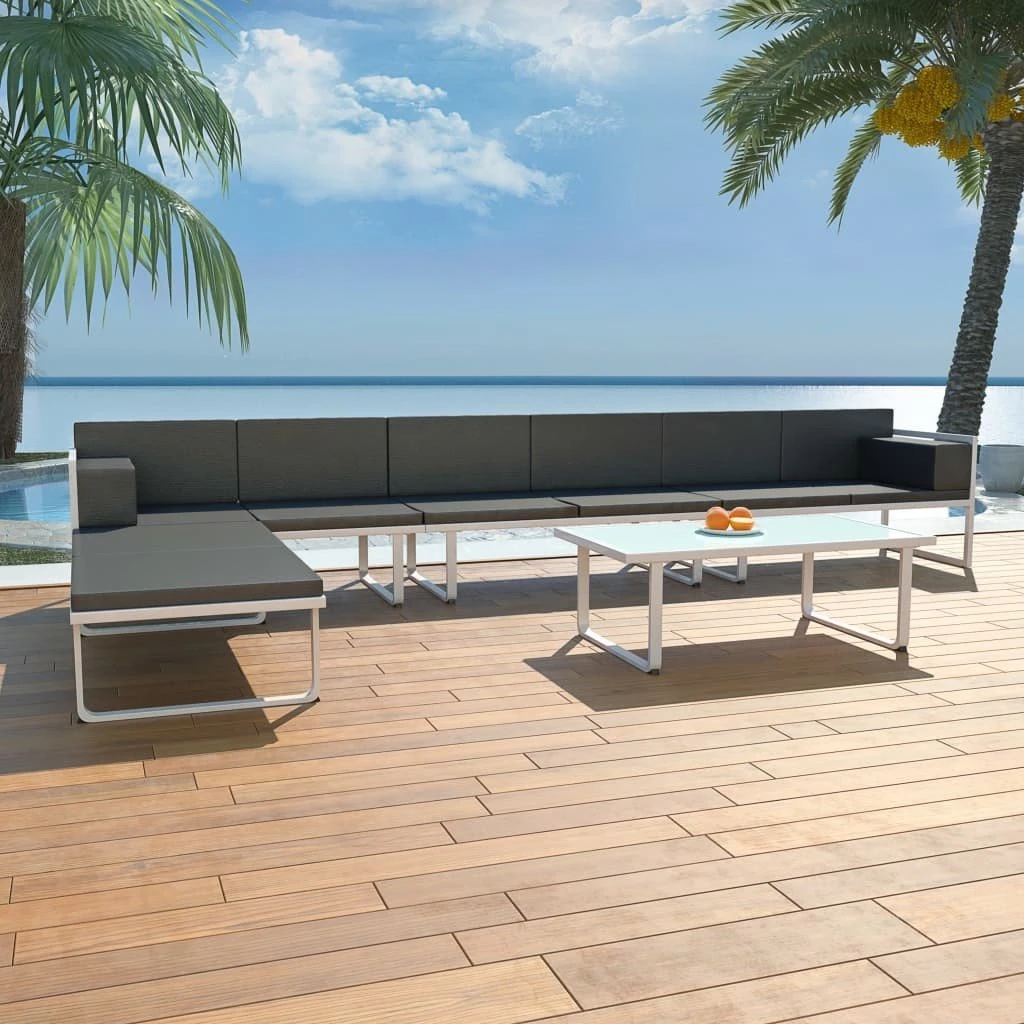 Este set de sofás de jardín de calidad superior combina estilo y funcionalidad y se convertirá en la principal atracción de tu jardín o patio. El set completo de muebles está diseñado para ser usado en el exterior durante todo el año. Gracias a su estructura de 100% aluminio, el set de sofás es muy fácil de limpiar, duradero e ideal para el uso diario. Los asientos están hechos de textilene, el cual es cómodo y resistente a la intemperie. Los cojines gruesos y extraíbles de los asientos y del respaldo son cómodos y lavables. La entrega incluye dos sofás de 2 plazas (izquierdo y derecho, 1 sofá sin reposabrazos, 1 otomana, 1 mesa de centro con una cubierta de vidrio de 5 mm de grosor, 4 cojines para el asiento, 6 cojines para el respaldo y 2 cojines para reposabrazos. Nota: Le recomendamos que tape el mueble en condiciones de lluvia, nieve y heladas. Color del sofa: Negro y blancoColor de la mesa: BlancoColor cojín: NegroMaterial del sofá: Marco 100% recubierto en polvo + asiento de textileneMaterial de la funda de cojín: Tela (100% poliésterDimensiones totales: 379 x 193 x 60 cm (ancho x profundo x altoDimensiones del sofá de 2 plazas (izquierda y derecha: 127 x 68 x 60 cm (ancho x profundo x altoDimensiones del sofá sin reposabrazos: 125 x 68 x 60 cm (ancho x profundo x altoDimensiones de otomana: 125 x 66 x 32 cm (ancho x profundo x altoDimensiones de la mesa de centro: 110 x 60 x 38 cm (largo x ancho x altoDimensiones de cojín para reposabrazos: 57 x 18 x 18 cm (largo x ancho x altoGrosor del cojín para asiento y respaldo: 6 cmAltura del asiento desde el suelo: 32 cmLa entrega incluye:1 x Sofá izquierdo de 2 plazas1 x Sofá derecho de 2 plazas1 x Sofá sin reposabrazos1 x Otomana1 x Mesita de café con la superficie de vidrio de 5 mm de grosor4 x Cojines de asiento6 x Cojines de respaldo2 x Cojines de reposabrazosMaterial: Poliéster: 30%, PVC: 70%