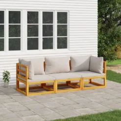 ¡Disfruta de una taza de café o té con un tiempo agradable en el espacio al aire libre de la casa con este elegante juego de muebles de jardín de madera! Madera maciza de acacia: Este juego de muebles de jardín está hecho de madera maciza de acacia. La madera maciza de acacia es un bonito material natural. La madera de acacia es una madera dura tropical, densa, robusta y duradera.Cómodo asiento: El respaldo añade un plus de comodidad al sofá. Además, los cojines gruesos y acolchados proporcionan comodidad al asiento.Diseño modular: El juego de sofás de jardín es flexible y fácil de mover, por lo que puedes combinarlo con otros segmentos modulares de la tienda web para crear tus propias configuraciones personales de juegos de muebles para jardín. Información útil:Para facilitar al máximo el montaje, cada producto se entrega con un manual. Nota:Para asegurarte de que tus muebles de exterior se mantengan hermosos, recomendamos protegerlos con una funda impermeable. Material de la silla: Madera maciza de acacia con un acabado de aceiteSofá esquinero:Dimensiones: 70,5 x 70,5 x 65 cm (ancho x profundo x altoAltura del asiento desde el suelo (sin cojín: 29 cmCapacidad de carga máxima: 110 kgSofá central:Dimensiones: 68 x 70,5 x 65 cm (ancho x profundo x altoAltura del asiento desde el suelo (sin cojín: 29 cmCapacidad de carga máxima: 110 kgCojín:Color del cojín: Gris claroMaterial de la funda del cojín: Tela (100% poliésterMaterial de relleno: Espuma, fibra de algodónDimensiones del cojín de asiento: 68 x 68 x 6 cm (ancho x profundo x altoDimensiones del cojín de respaldo (grande: 68 x 45 x 15 cm (ancho x profundo x altoDimensiones del cojín de respaldo (pequeño: 58 x 45 x 15 cm (ancho x profundo x altoLa entrega incluye:2 x Sofás esquineros1 x Sofá central3 x Cojines de asiento3 x Cojines de respaldo (grande2 x Cojines de respaldo (pequeño