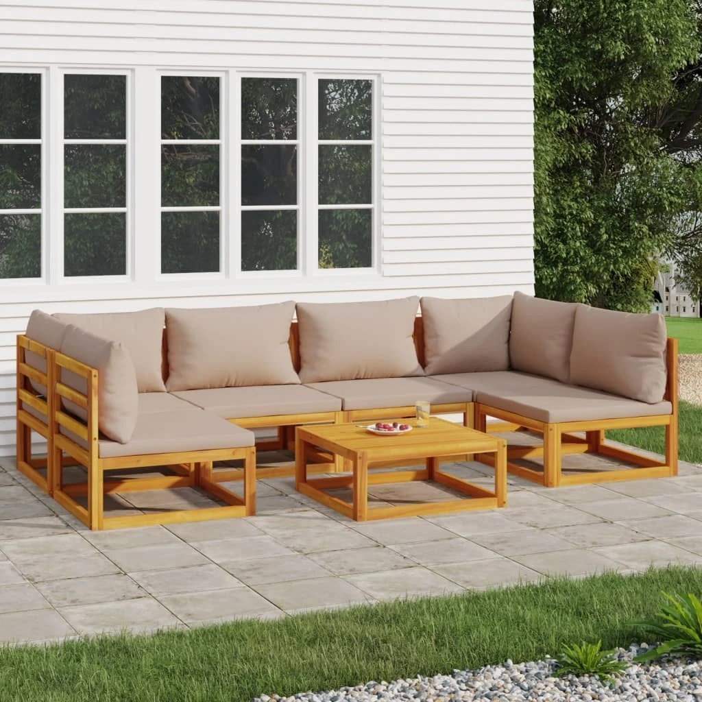 ¡Disfruta de una taza de café o té con un tiempo agradable en el espacio al aire libre de la casa con este elegante juego de muebles de jardín de madera! Madera maciza de acacia: Este juego de muebles de jardín está hecho de madera maciza de acacia. La madera maciza de acacia es un bonito material natural. La madera de acacia es una madera dura tropical, densa, robusta y duradera.Cómodo asiento: El respaldo añade un plus de comodidad al sofá. Además, los cojines gruesos y acolchados proporcionan comodidad al asiento.Mesa práctica: La mesa resistente es perfecta para colocar comidas, bebidas y otros artículos decorativos.Diseño modular: El juego de sofás de jardín es flexible y fácil de mover, por lo que puedes combinarlo con otros segmentos modulares de la tienda web para crear tus propias configuraciones personales de juegos de muebles para jardín. Información útil:Para facilitar al máximo el montaje, cada producto se entrega con un manual. Nota:Para asegurarte de que tus muebles de exterior se mantengan hermosos, recomendamos protegerlos con una funda impermeable. Material de la silla: Madera maciza de acacia con un acabado de aceiteMesa:Dimensiones: 68 x 68 x 29 cm (ancho x profundo x altoSofá esquinero:Dimensiones: 70,5 x 70,5 x 65 cm (ancho x profundo x altoAltura del asiento desde el suelo (sin cojín: 29 cmCapacidad de carga máxima: 110 kgSofá central:Dimensiones: 68 x 70,5 x 65 cm (ancho x profundo x altoAltura del asiento desde el suelo (sin cojín: 29 cmCapacidad de carga máxima: 110 kgCojín:Color del cojín: Gris taupéMaterial de la funda del cojín: Tela (100% poliésterMaterial de relleno: Espuma, fibra de algodónDimensiones del cojín de asiento: 68 x 68 x 6 cm (ancho x profundo x altoDimensiones del cojín de respaldo (grande: 68 x 45 x 15 cm (ancho x profundo x altoDimensiones del cojín de respaldo (pequeño: 58 x 45 x 15 cm (ancho x profundo x altoLa entrega incluye:2 x Sofás esquineros4 x Sofás centrales1 x Mesa de centro6 x Cojines de asiento6 x Cojines de respaldo (grande2 x Cojines de respaldo (pequeño