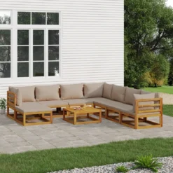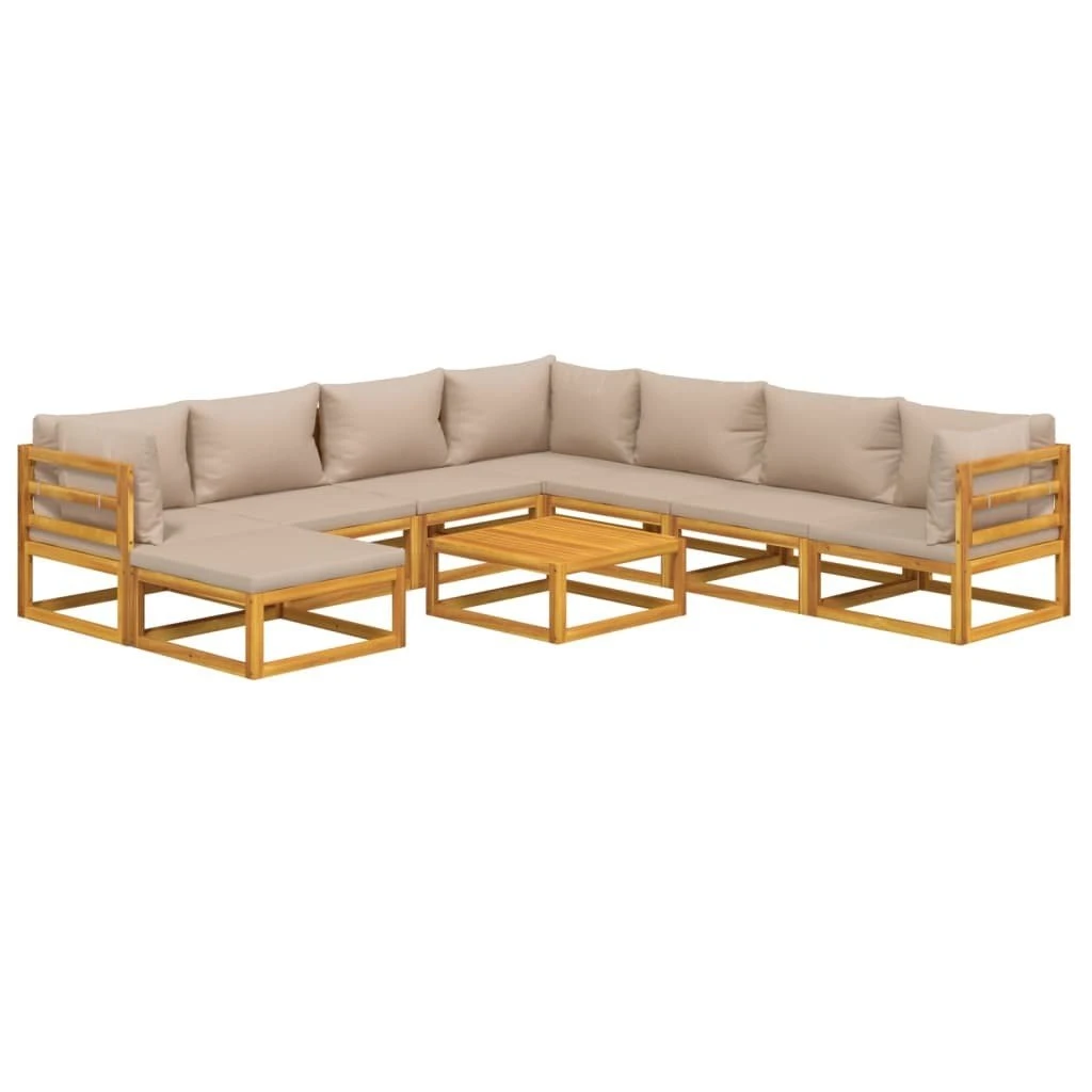 ¡Disfruta de una taza de café o té con un tiempo agradable en el espacio al aire libre de la casa con este elegante juego de muebles de jardín de madera! Madera maciza de acacia: Este juego de muebles de jardín está hecho de madera maciza de acacia. La madera maciza de acacia es un bonito material natural. La madera de acacia es una madera dura tropical, densa, robusta y duradera.Cómodo asiento: El respaldo añade un plus de comodidad al sofá. Además, los cojines gruesos y acolchados proporcionan comodidad al asiento.Mesa práctica: La mesa resistente es perfecta para colocar comidas, bebidas y otros artículos decorativos.Diseño modular: El juego de sofás de jardín es flexible y fácil de mover, por lo que puedes combinarlo con otros segmentos modulares de la tienda web para crear tus propias configuraciones personales de juegos de muebles para jardín. Información útil:Para facilitar al máximo el montaje, cada producto se entrega con un manual. Nota:Para asegurarte de que tus muebles de exterior se mantengan hermosos, recomendamos protegerlos con una funda impermeable. Material de la silla: Madera maciza de acacia con un acabado de aceiteMesa:Dimensiones: 68 x 68 x 29 cm (ancho x profundo x altoSofá esquinero:Dimensiones: 70,5 x 70,5 x 65 cm (ancho x profundo x altoAltura del asiento desde el suelo (sin cojín: 29 cmCapacidad de carga máxima: 110 kgSofá central:Dimensiones: 68 x 70,5 x 65 cm (ancho x profundo x altoAltura del asiento desde el suelo (sin cojín: 29 cmCapacidad de carga máxima: 110 kgReposapiés:Dimensiones: 68 x 68 x 29 cm (ancho x profundo x altoCojín:Color del cojín: Gris taupéMaterial de la funda del cojín: Tela (100% poliésterMaterial de relleno: Espuma, fibra de algodónDimensiones del cojín de asiento: 68 x 68 x 6 cm (ancho x profundo x altoDimensiones del cojín de respaldo (grande: 68 x 45 x 15 cm (ancho x profundo x altoDimensiones del cojín de respaldo (pequeño: 58 x 45 x 15 cm (ancho x profundo x altoLa entrega incluye:3 x Sofá esquinero4 x Sofás centrales1 x Reposapiés1 x Mesa de centro8 x Cojín de asiento7 x Cojines de respaldo (grande3 x Cojnes de respaldo (pequeño