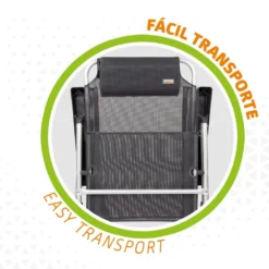 - Resistente: estructura de aluminio y asiento de textileno, soporta un peso máximo de 110 kg