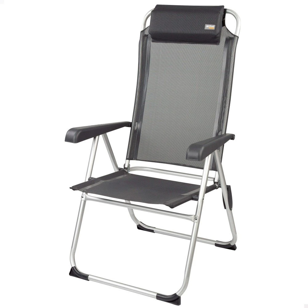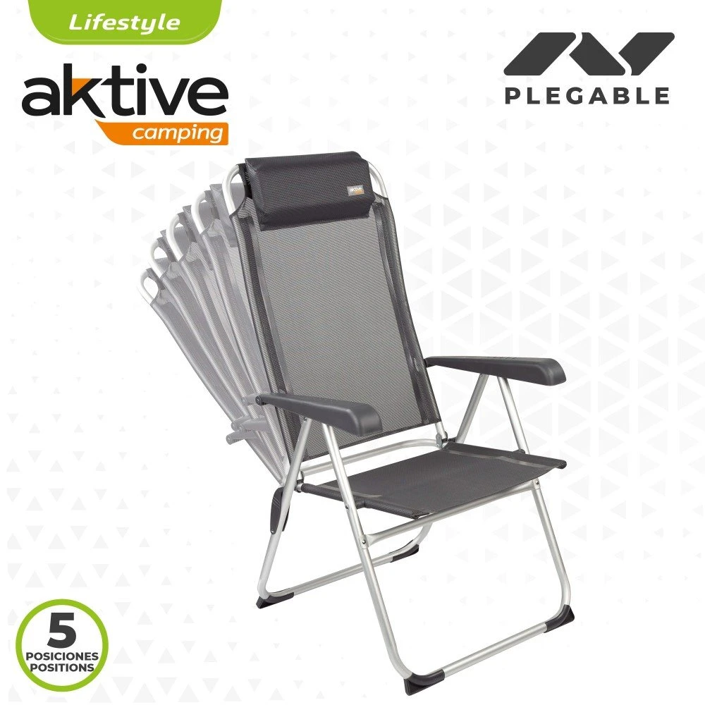 ¡Disfruta al aire libre con las sillas plegables Aktive! Silla plegable con medidas desplegada 44,5 x 55 x 101 cm, plegada 58 x 11 x 86,5 cm, altura del asiento de 38 cm. Ideal para ir a la playa, para disfrutar de un día de piscina en el jardín o para tus espacadas a la montaña o al camping. Tiene un diseño en color negro con tejido de textileno, un material que se lava con facilidad y que es resistente. Una silla plegable resistente con estructura de aluminio y asiento de textileno que soporta un peso máximo de 110 kg. Además, es mutiposición, ofrece 5 posiciones diferentes ajustables con los reposabrazos ergonómicos y tiene tacos antivuelco en las patas. Transpórtala con facilidad gracias a su peso ligero y a sus sistema de plegado fácil y rápido.