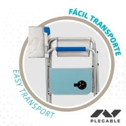 - Medidas: silla desplegada 60x57x103 cm; silla plegada 56,5x13x104,5 cm; altura asiento 62 cm; altura desde el reposapiés 43 cm