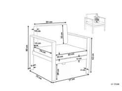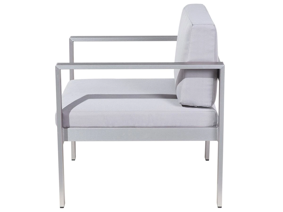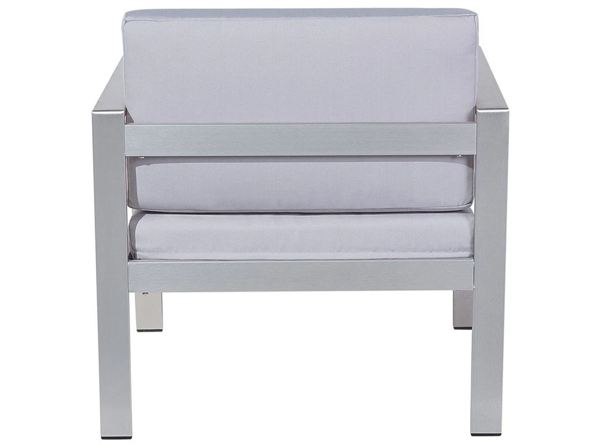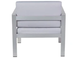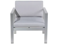 Sillón tapizado de diseño moderno. Esta silla de jardín de tapizado suave ofrece la máxima comodidad de asiento. Está fabricada a partir de aluminio inoxidable y consta de cojines de asiento y de respaldo. Las fundas de cojín están hechas de poliéster de alta calidad e incluyen un revestimiento que repele la suciedad y la humedad. Detalles: Tipo de Producto: Silla de jardín Estilo: Moderno Color: Gris Tonalidad: Gris claro Tipo de material: Metal Material principal: Aluminio Material adicional: Poliéster Material de las patas: Metal Material del asiento: Tejido Composición del Material: 100% Poliéster Apoyabrazo: Sí Acabado: Mate Plegable: Sí Densidad de espuma del asiento: 20 kg/m3 Apilable: No Dimensiones: Altura del apoyabrazos: 62 cm Profundidad: 70 cm Espesor del asiento: 7 cm Altura del asiento: 42 cm Ancho: 77 cm Altura: 80 cm Superficie del asiento: 65×60 cm Peso: 12 kg Capacidad de peso: 150 kg La oferta incluye: 1 x Silla, 1 x Cojín del asiento, 1 x Cojín del respaldo Ventajas: Diseño moderno, Ideal para uso al aire libre, Resistencia UV 6 (ISO 105-B02, No requiere mantenimiento regular, Patas con tapas antideslizantes de seguridad Información de montaje: Requiere montaje completo. 20-40 min. Información adicional: Abre el embalaje con cuidado, especialmente cuando utilizas herramientas afiladas o puntiagudas, ya que pueden dañar el producto Texto de resistencia: El producto está hecho con tela resistente a los rayos UV, lo que significa que se puede usar bajo la luz del sol sin preocuparse por la pérdida de color. En cualquier caso, es recomendable colocar los muebles debajo de una cubierta impermeable cuando no se utilicen, para asegurar su máxima durabilidad. Resistencia: Rayos UV Consejos de mantenimiento: Aluminio: 1.Limpiar con agua jabonosa y detergentes suaves. Quitar el polvo con un paño suave 2.Fuera de temporada, utilice una funda protectora o guarde los muebles en un lugar fresco y seco. Poliéster: 1.Lavar a mano únicamente, usar agua fría y un detergente suave 2.Cuando no esté en uso, manténgalo en un lugar limpio y seco para protegerlo de las condiciones atmosféricas 3.No secar en secadora ni planchar.