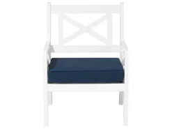 Práctica silla de jardín hecha de madera de acacia. Añade a tu zona exterior esta silla de jardín práctica y versátil. Está fabricada a partir de madera de acacia de alta calidad. El cojín de asiento acolchado repele la suciedad con facilidad. Viene con una funda extraíble de poliéster. La estructura abierta y brillante aporta un toque marítimo al diseño. Detalles: Tipo de Producto: Silla de jardín Estilo: Tradicional Color: Blanco Tipo de material: Madera maciza Material principal: Madera de acacia Material adicional: Poliéster Material de las patas: Madera maciza Material del asiento: Tejido Composición del Material: 100% Poliéster Apoyabrazo: Sí Acabado: Aceitado Plegable: No Densidad de espuma del asiento: 18 kg/m3 Apilable: No Dimensiones: Altura del apoyabrazos: 60 cm Profundidad: 69 cm Espesor del asiento: 10 cm Altura del asiento: 44 cm Ancho: 65 cm Altura: 90 cm Superficie del asiento: 59×59 cm Peso: 22 kg Capacidad de peso: 130 kg La oferta incluye: 1 x Silla, 1 x Cojín del asiento Ventajas: El grueso acolchado del asiento brinda comodidad, Estilo escandinavo minimalista, Ideal para uso al aire libre, Resiste a todo tipo de clima, Resistencia UV 4 (ISO 105-B02, Fácil de desplazar Información de montaje: Requiere montaje parcial. 5-15 min. Información adicional: El producto viene con un libro de cuidados detallado para ayudarte a mantener tus muebles en las mejores condiciones durante muchos años. Consulta estos consejos para garantizar el mantenimiento adecuado de tus muebles nuevos – encontrarás las instrucciones de mantenimiento junto con el manual de montaje. Texto de resistencia: Gracias a su resistencia al agua, puedes utilizar el producto al aire libre y dejarlo a la intemperie durante lluvias ligeras. Si no es posible guardarlo en un lugar cerrado y protegido, recomendamos utilizar una funda protectora. La exposición prolongada a la humedad puede provocar daños en el mueble. Resistencia: Agua ligera / humedad Consejos de mantenimiento: Madera de acacia: 1.Durante el invierno o en condiciones climáticas adversas, utilice una funda protectora o guarde los muebles en el interior 2.Los muebles con acabado de aceite deben volverse a engrasar antes de ponerlos en uso y al menos una vez al año, especialmente en el clima húmedo 3.Limpiar con un limpiador suave y un paño suave en la dirección de la veta. Secar con un paño inmediatamente después de limpiar. Poliéster: 1.Lavar a mano o seleccionar un ciclo de lavado de lana (30 ° C, a menos que el fabricante especifique lo contrario. Lavar del revés con la cremallera cerrada 2.Cuando no esté en uso, manténgalo en un lugar limpio y seco para protegerlo de las condiciones atmosféricas 3.No secar en secadora y no planchar.