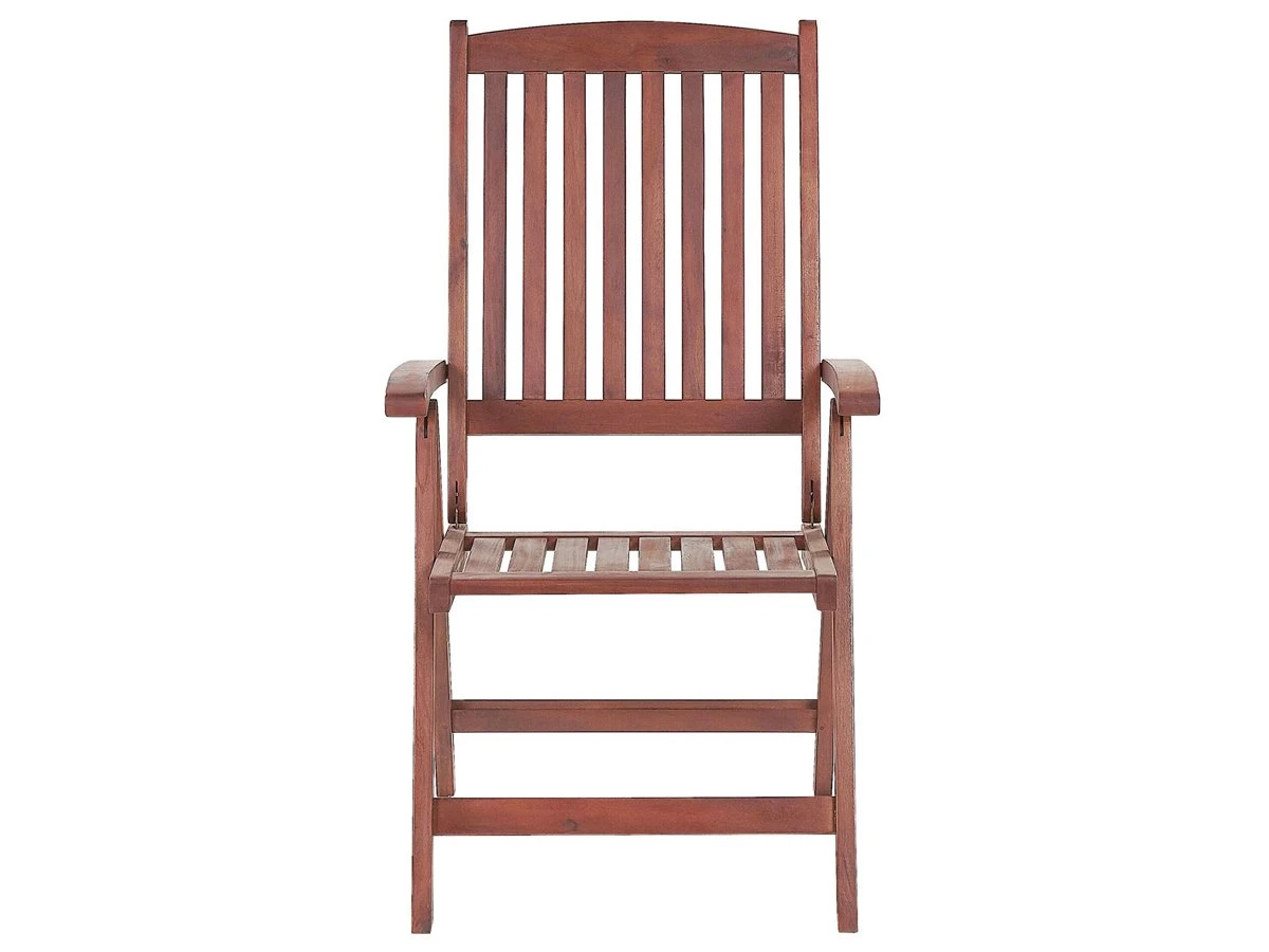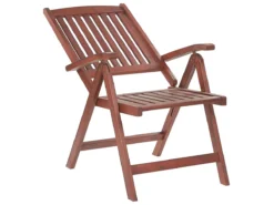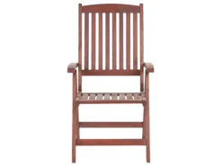 Silla de jardín en madera con el respaldo regulable. Agrega un toque de encanto campestre a tu jardín con esta elegante silla de inspiración rústica. Fabricada con madera de acacia de alta calidad en un color marrón claro neutro, esta silla complementa cualquier entorno al aire libre. La relajación también está garantizada gracias al respaldo reclinable de la silla que le permite configurar esta pieza como desees y, para mayor comodidad, la silla se puede plegar para un fácil almacenamiento. Detalles: Tipo de Producto: Conjunto plegable Estilo: Rústico Color: Madera oscura Tonalidad: Rojo oscuro Tipo de material: Madera maciza Material principal: Madera de acacia Material adicional: Acero Material de las patas: Madera maciza Material del asiento: Madera maciza Apoyabrazo: Sí Acabado: Aceitado Plegable: Sí Apilable: No Dimensiones: Altura del apoyabrazos: 23 cm Profundidad: 69 cm Altura del asiento: 44 cm Ancho: 54 cm Altura: 105 cm Superficie del asiento: 48×43 cm Peso: 10 kg Capacidad de peso: 160 kg La oferta incluye: 1 x Silla Ventajas: Diseño atemporal, Combina con todo tipo de decoración, Apariencia moderna y calidad durante muchos años, Plegable, ahorra espacio, Materiales naturales Información de montaje: No requiere montaje Información adicional: Por favor, ten en cuenta que la madera es un producto natural, y cada pieza puede presentar ligeras variaciones. Las diferencias en el color o la textura, como las arrugas u otras características naturales, no se consideran un defecto ni tampoco una base de reclamación, El producto viene con un libro de cuidados detallado para ayudarte a mantener tus muebles en las mejores condiciones durante muchos años. Consulta estos consejos para garantizar el mantenimiento adecuado de tus muebles nuevos – encontrarás las instrucciones de mantenimiento junto con el manual de montaje. Texto de resistencia: Gracias a su resistencia al agua, puedes utilizar el producto al aire libre y dejarlo a la intemperie durante lluvias ligeras. Si no es posible guardarlo en un lugar cerrado y protegido, recomendamos utilizar una funda protectora. La exposición prolongada a la humedad puede provocar daños en el mueble. Resistencia: Manchas Consejos de mantenimiento: Madera de acacia: 1.Los muebles con acabado de aceite deben volverse a engrasar antes de ponerlos en uso y al menos una vez al año, especialmente en el clima húmedo 2.Limpiar con un limpiador suave y un paño suave en la dirección de la veta. Secar con un paño inmediatamente después de limpiar 3.Durante el invierno o en condiciones climáticas adversas, utilice una funda protectora o guarde los muebles en el interior.