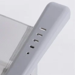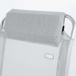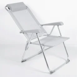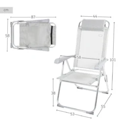 - Materiales: tejido de textileno ((resistente, transpirable y fácil de limpiar, estructura de aluminio (antioxidante y duradera y reposabrazos de plástico