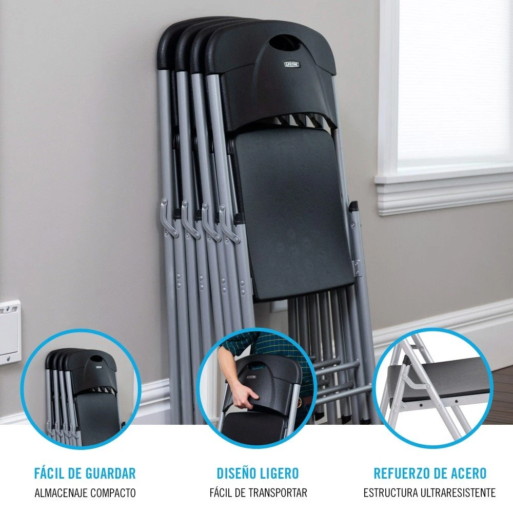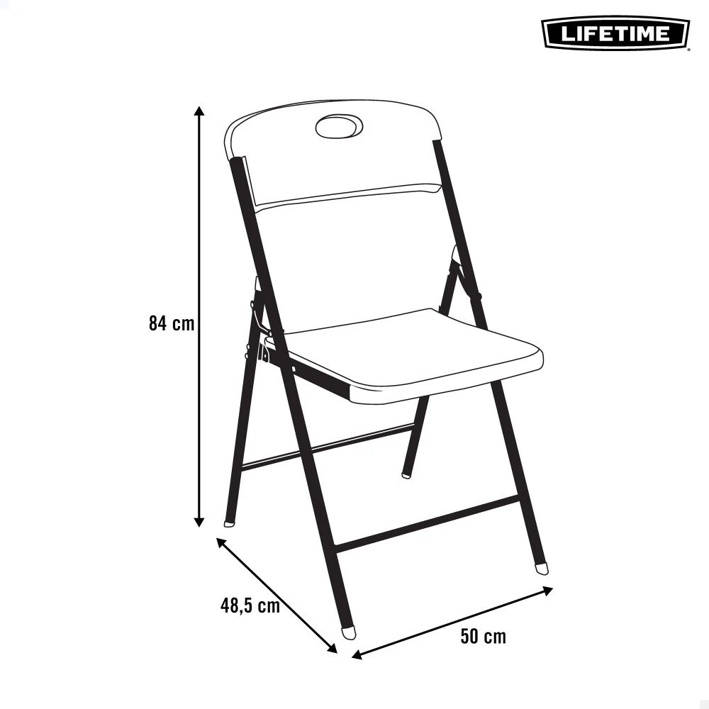 Silla plegable plástico negra, ligera y ultrarresistente Lifetime. Base y respaldo de polietileno de alta densidad con protección UV, resistente al agua y a las manchas. Estructura con tubos de acero con recubrimiento en polvo antióxido. Silla robusta, ultrarresistente y duradera. Medidas: 50 x 48,5 x 84 cm. Peso máximo soportado: 125 kg. Ideal para exterior o interior. Perfil estrecho, fácil transporte, limpieza y almacenaje.