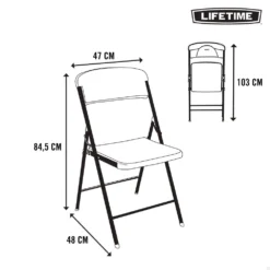 Silla plegable blanca, ligera y compacta LIFETIME. Base y respaldo contorneados de polietileno de alta densidad con protección UV, estructura con tubos de acero de 22 mm con recubrimiento en polvo. Silla robusta, ultrarresistente y duradera. Medidas abierta: 47 cm x 48 cm x 84,5 cm; cerrada: 47×103,5 cm. Peso silla 4 kg; peso soportado: 110 kg. Ideal para exterior o interior. Perfil estrecho, fácil transporte y almacenaje.