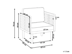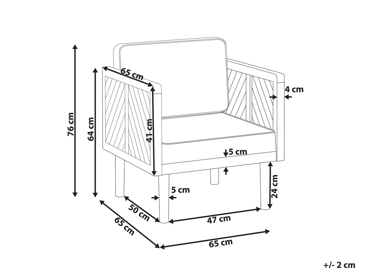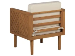 Sillón de jardín con cojines blancos. Añade comodidad a tu zona exterior con esta silla de jardín. Está fabricada a partir de madera de acacia resistente y de alta calidad. Los cojines de acolchado grueso ofrecen la máxima comodidad. Detalles: Tipo de Producto: Sillón Estilo: Moderno Color: Madera clara Tonalidad: Crema Tipo de material: Tejido Material principal: Madera de acacia Material adicional: Poliéster Material de las patas: Tejido Composición del Material: 100% Poliéster Apoyabrazo: Sí Acabado: Aceitado Plegable: No Densidad de espuma del asiento: 200 kg/m3 Apilable: No Dimensiones: Altura del apoyabrazos: 41 cm Profundidad: 65 cm Espesor del asiento: 9.5 cm Ancho: 65 cm Altura: 76 cm Superficie del asiento: 61×57 cm Peso: 12 kg Capacidad de peso: 150 kg La oferta incluye: 1 x Sillón, 1 x Cojín del asiento, 1 x Cojín del respaldo Ventajas: Cojines muy cómodos para un confort ideal, Perfecto para todo tipo de exterior, Muy fácil de conservar, Resistencia UV 6 (ISO 105-B02, Cojines extraíbles para un fácil mantenimiento Información de montaje: Requiere montaje completo. 20-40 min. Texto de resistencia: Gracias a su resistencia al agua, puedes utilizar el producto al aire libre y dejarlo a la intemperie durante lluvias ligeras. Si no es posible guardarlo en un lugar cerrado y protegido, recomendamos utilizar una funda protectora. La exposición prolongada a la humedad puede provocar daños en el mueble. Resistencia: Agua ligera / humedad Consejos de mantenimiento: Madera de acacia: 1.Durante el invierno o en condiciones climáticas adversas, utilice una funda protectora o guarde los muebles en el interior 2.Los muebles con acabado de aceite deben volverse a engrasar antes de ponerlos en uso y al menos una vez al año, especialmente en el clima húmedo 3.Limpiar con un limpiador suave y un paño suave en la dirección de la veta. Secar con un paño inmediatamente después de limpiar. Poliéster: 1.Lavar a mano o seleccionar un ciclo de lavado de lana (30 ° C, a menos que el fabricante especifique lo contrario. Lavar del revés con la cremallera cerrada 2.Cuando no esté en uso, manténgalo en un lugar limpio y seco para protegerlo de las condiciones atmosféricas 3.No secar en secadora y no planchar.