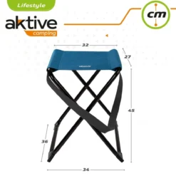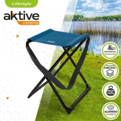 Taburete plegable de camping Aktive Sport con medidas 32x27x45 cm (ancho-profundo-alto. Estructura de acero resistente y asiento con tejido impermeable PVC 300D de fácil limpieza. Incorpora 1 asa cruzada para poder transportarla con facilidad. Soporta un peso máximo de 100Kg. Fácil de montar y plegar.